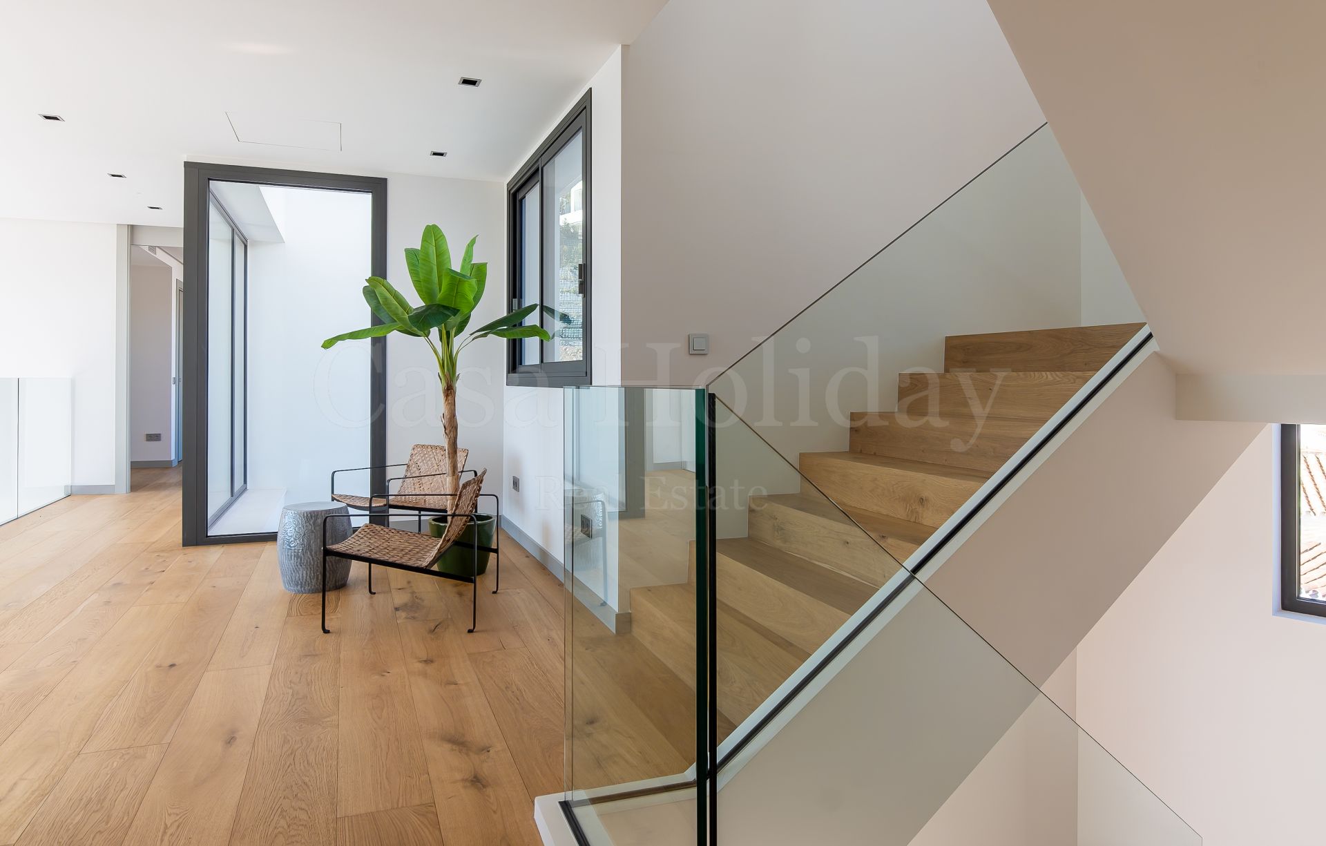 Set on a 1,377m² plot, this 764m² home blends modern architecture, sophisticated living spaces, natural elements and outstanding customisation potential. You enter the house through a landscaped courtyard and an oversized timber pivot door into the main level that features two lounge areas with panoramic sea views, a fully equipped open-plan kitchen and dining area that looks both to the sea and mountains, plus two spacious guest bedrooms with ensuites and an aseo. The main living area features a fireplace and double height-ceiling that opens out onto the main terrace, where you can dine or relax by the saltwater infinity pool (with pre-installation for heating) and jacuzzi while enjoying panoramic views.