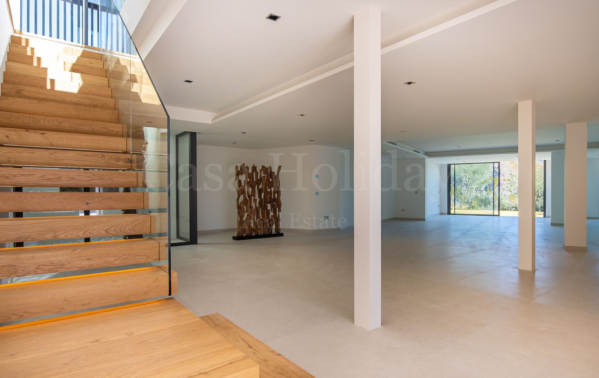 The villa’s outdoor spaces include two gardens with gorgeous views, the main terrace and pool area, plus a spacious 158m2 solarium with pre-installation for an outdoor kitchen and 360º views of the sea, golf course, and mountains. The solarium also features a garden area, and there is pre-installation to install a lift from the basement level. With water-based underfloor heating throughout and Hansgroe fittings, this property offers modern comforts, spectacular views, and a sought-after location, making it an exceptional opportunity for those seeking views, privacy, space, and convenience.