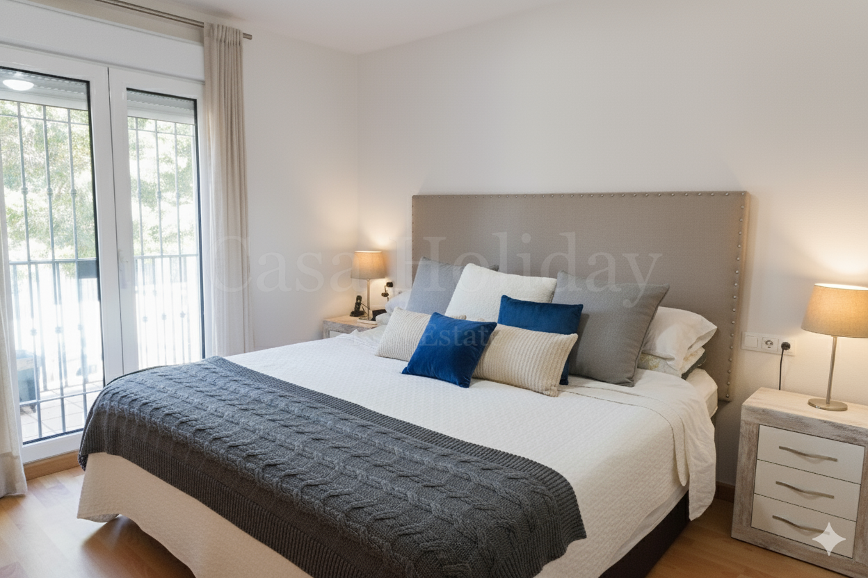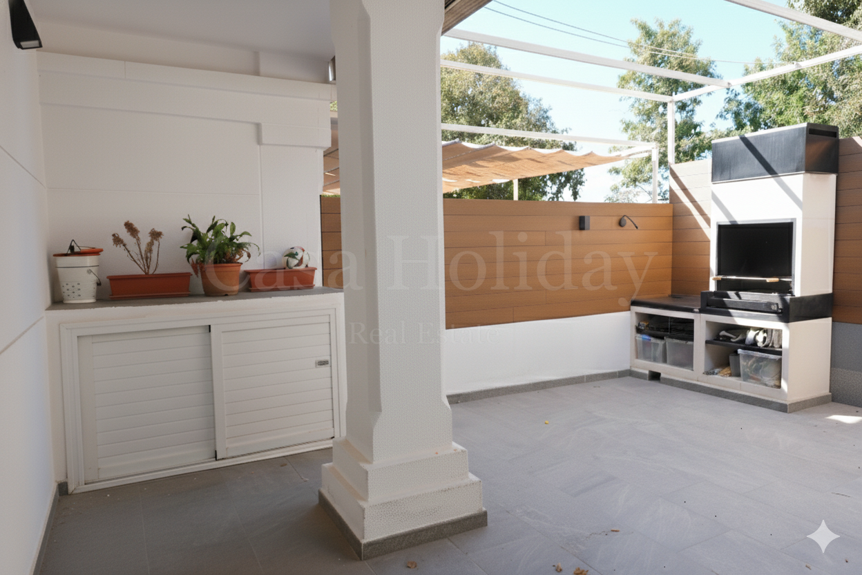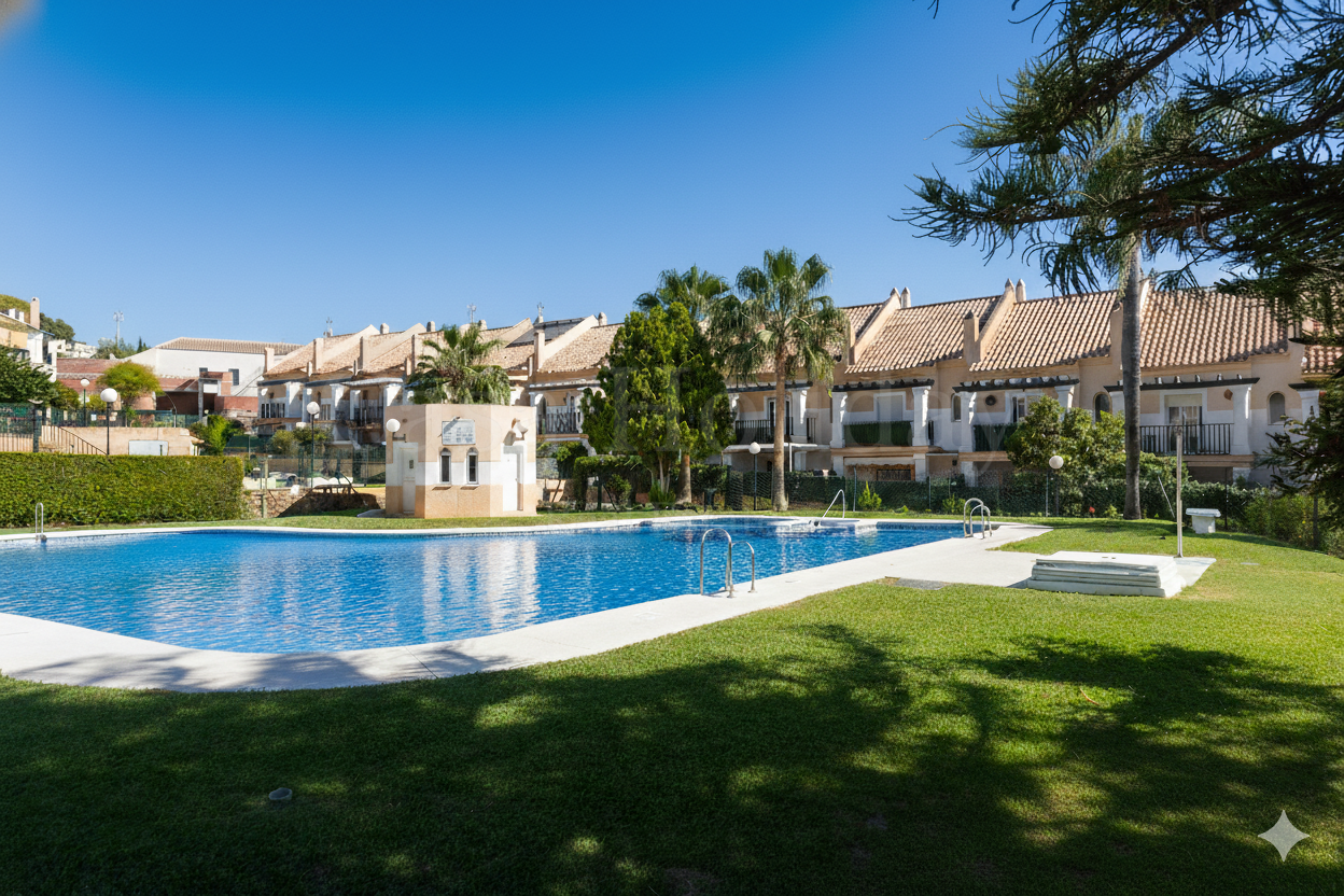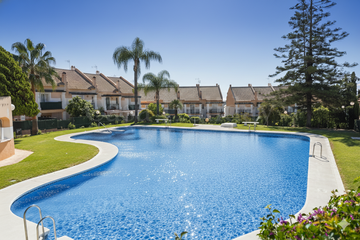 Spacious and charming four-bedroom Andalusian townhouse located in the gated community of Sierramar, within walking distance to Marbella centre and the main bus station. Spread across three levels, this lovely home features a master bedroom with ensuite and private terrace, plus additional guest bedrooms and well-appointed bathrooms. The main level offers a bright fully equipped kitchen, guest toilet, and a large open-plan living and dining area with direct access to a private terrace and BBQ area, perfect for outdoor dining. On the second level are two guest bedrooms and the master suite, while the top floor hosts a fourth bedroom currently used as an office and lounge with a terrace boasting sea views. Additional highlights include fitted wardrobes, air conditioning, and private parking. The Sierramar community offers residents a large communal swimming pool, a separate children’s pool, and beautifully maintained gardens.