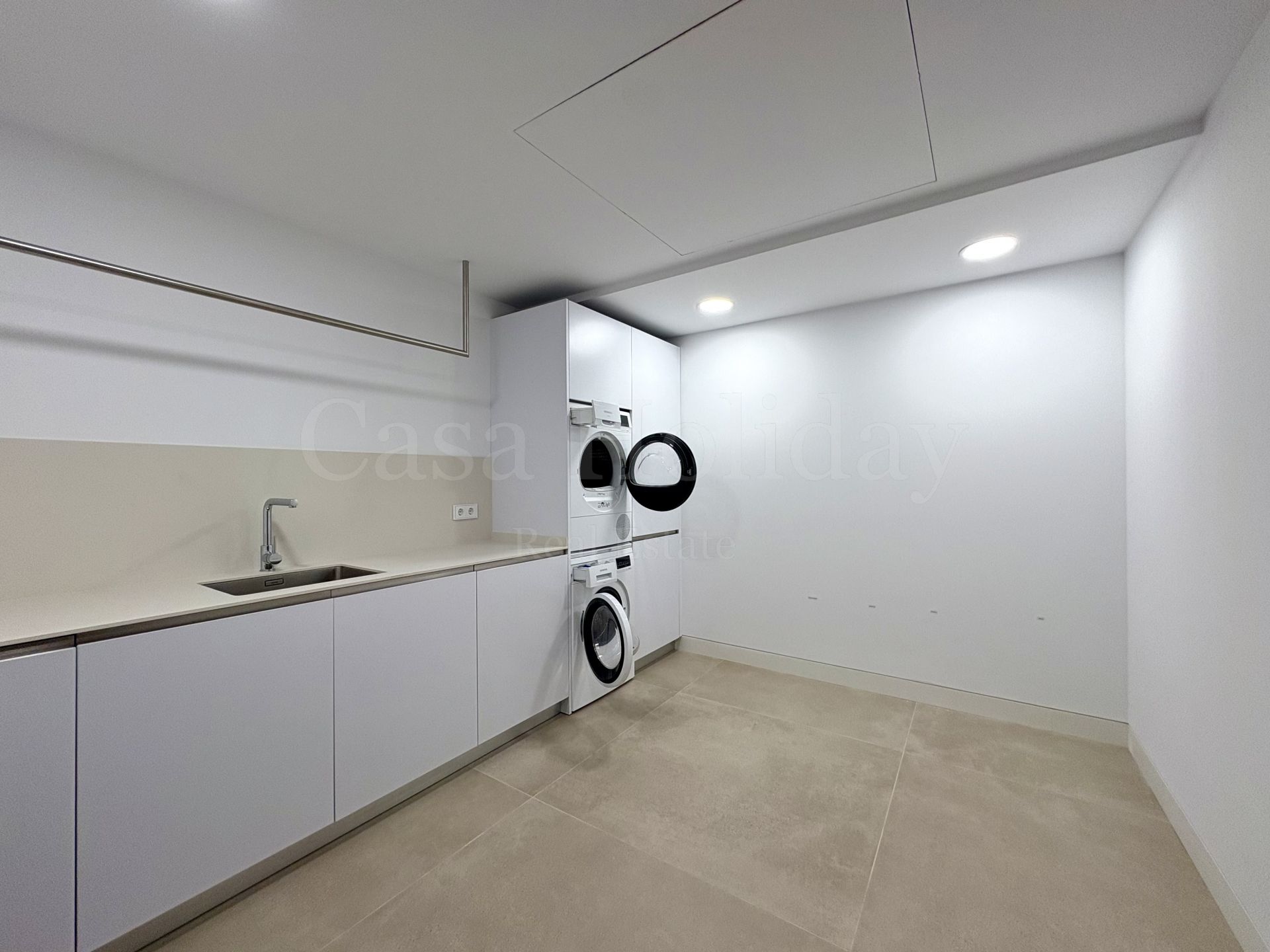 The lower level is dedicated to leisure and wellness, featuring pre-installation for a state-of-the-art indoor golf training studio with Trackman technology, as well as a sauna, cold plunge pool, laundry room, and generous storage areas. Practical additions include a garage for 2–3 cars, technical room, and further utility spaces.
