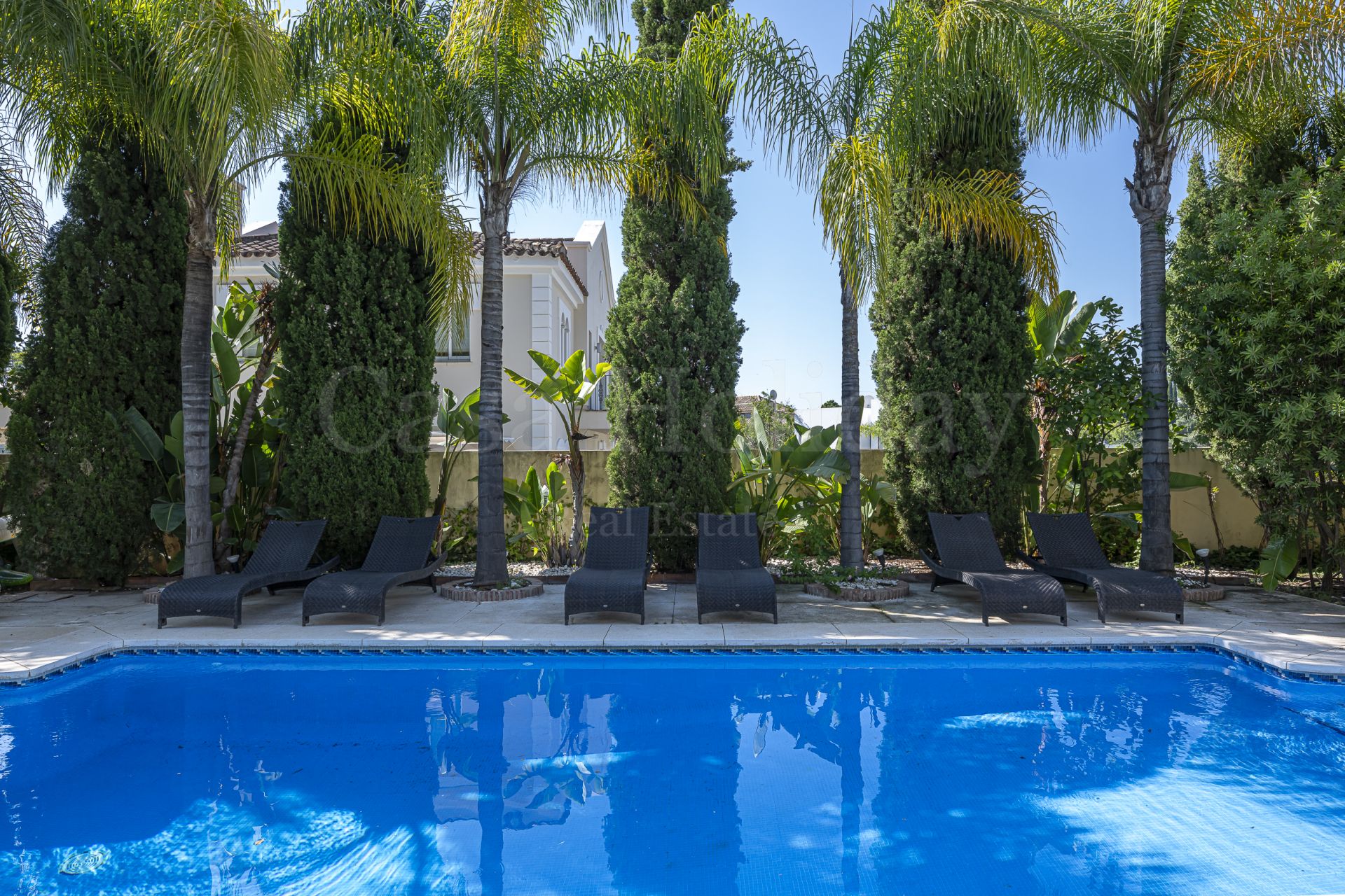 En la planta inferior, un apartamento independiente ofrece un dormitorio, sala de estar y baño completo, actualmente utilizado como alojamiento para invitados pero fácilmente adaptable a un garaje cerrado para hasta tres coches. La parcela supera los 1.400 m² y cuenta con jardines paisajísticos, zonas de sombra, riego automático y una piscina climatizada para disfrutar durante todo el año. Varias terrazas, tanto cubiertas como descubiertas, ofrecen el entorno perfecto para cenas al aire libre o momentos de relajación.