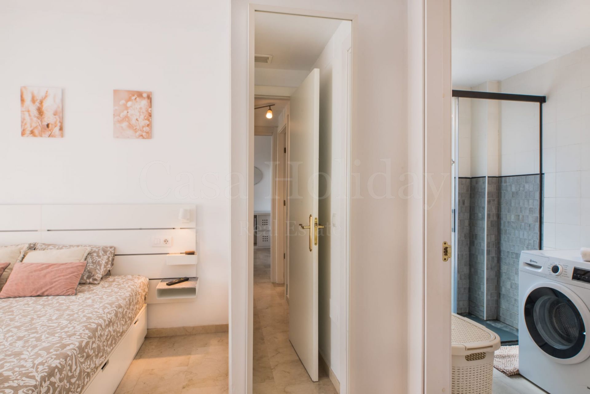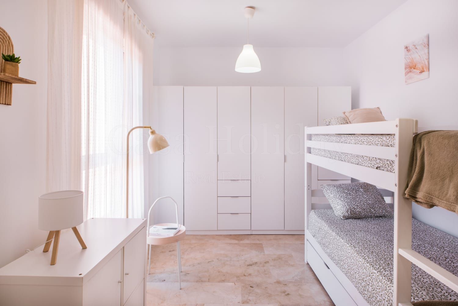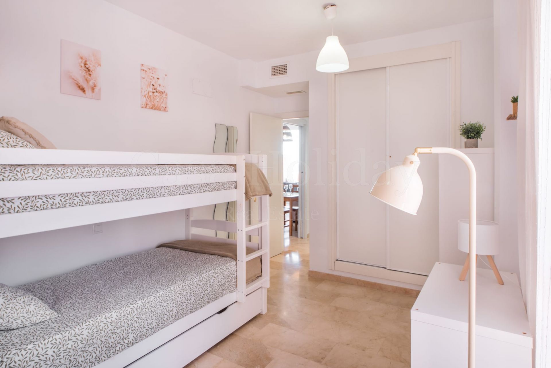 Este apartamento de estilo moderno cuenta con tres dormitorios, una habitación principal con cama doble, otra con cama litera de dos camas individuales y un tercer dormitorio con cama individual. Dispone de un salón-comedor abierto con sofá, cocina totalmente equipada (nevera, horno, microondas, cafetera, lavadora) y dos baños completo con ducha. Grandes ventanales y una terraza amplia privada te permitirán disfrutar de luz natural y vistas al mar y el jardín. La decoración combina tonos neutros con detalles marítimos, ofreciendo un ambiente relajante y moderno. Hay toallas y ropa de cama en el apartamento y ofrece parking privado gratis.