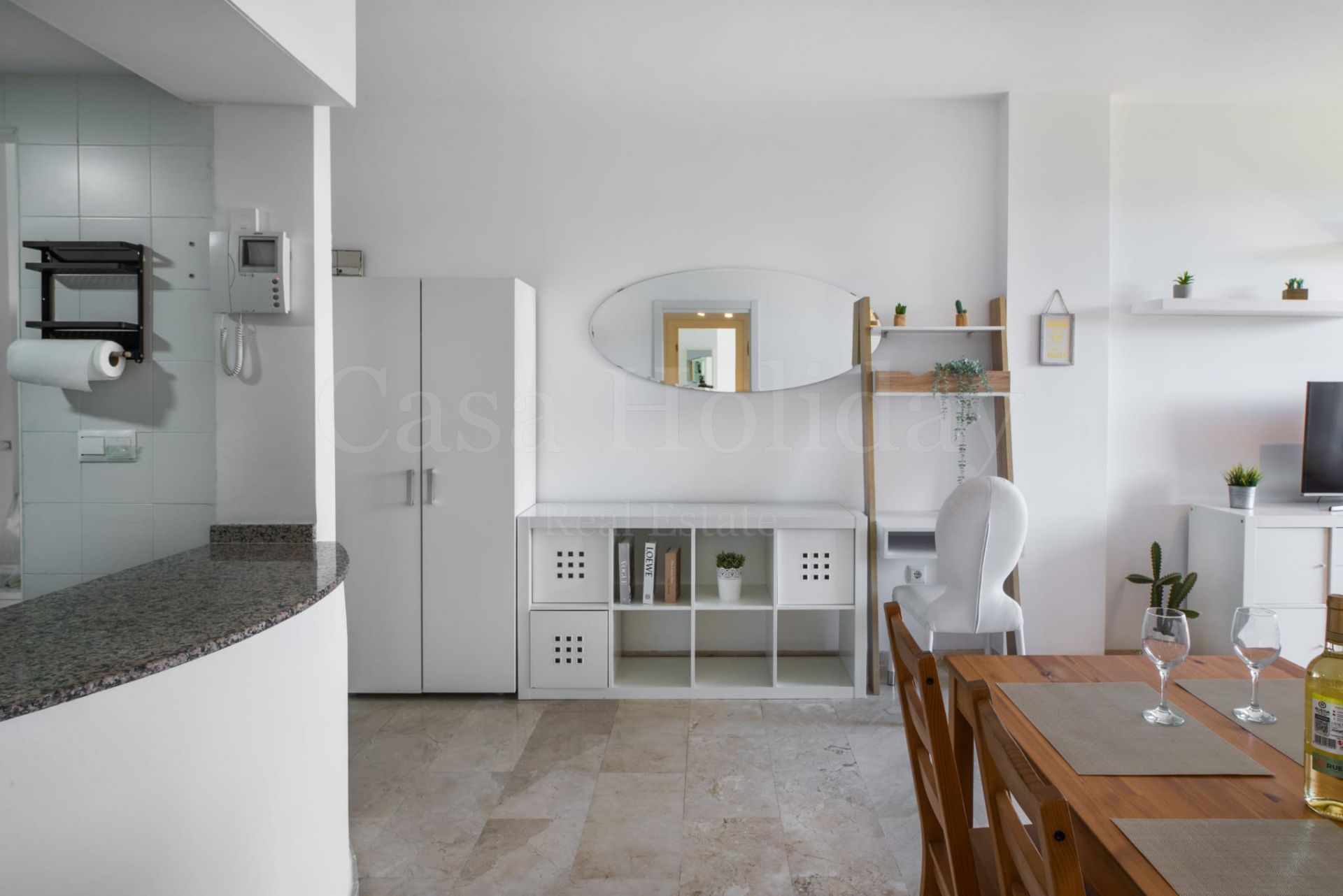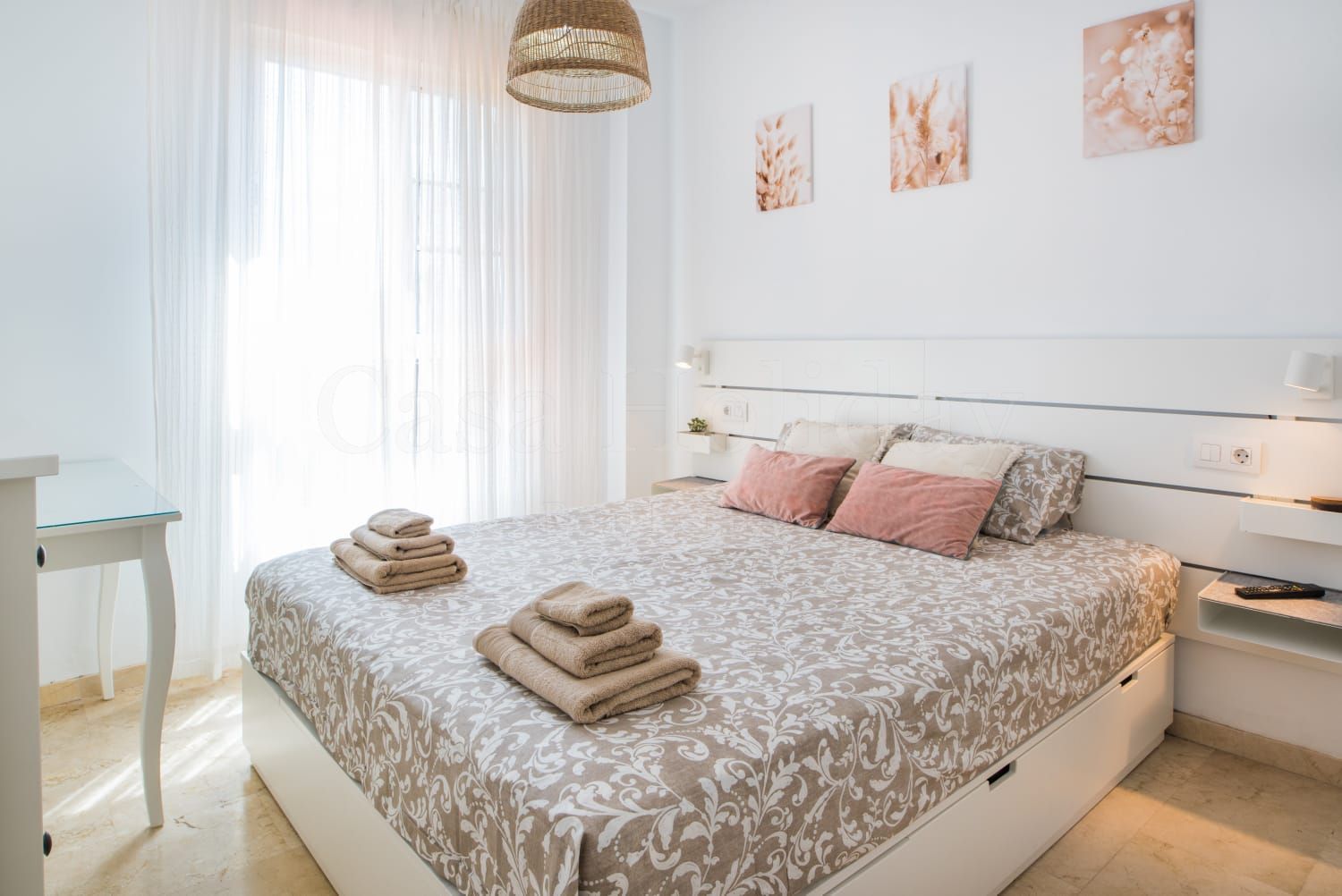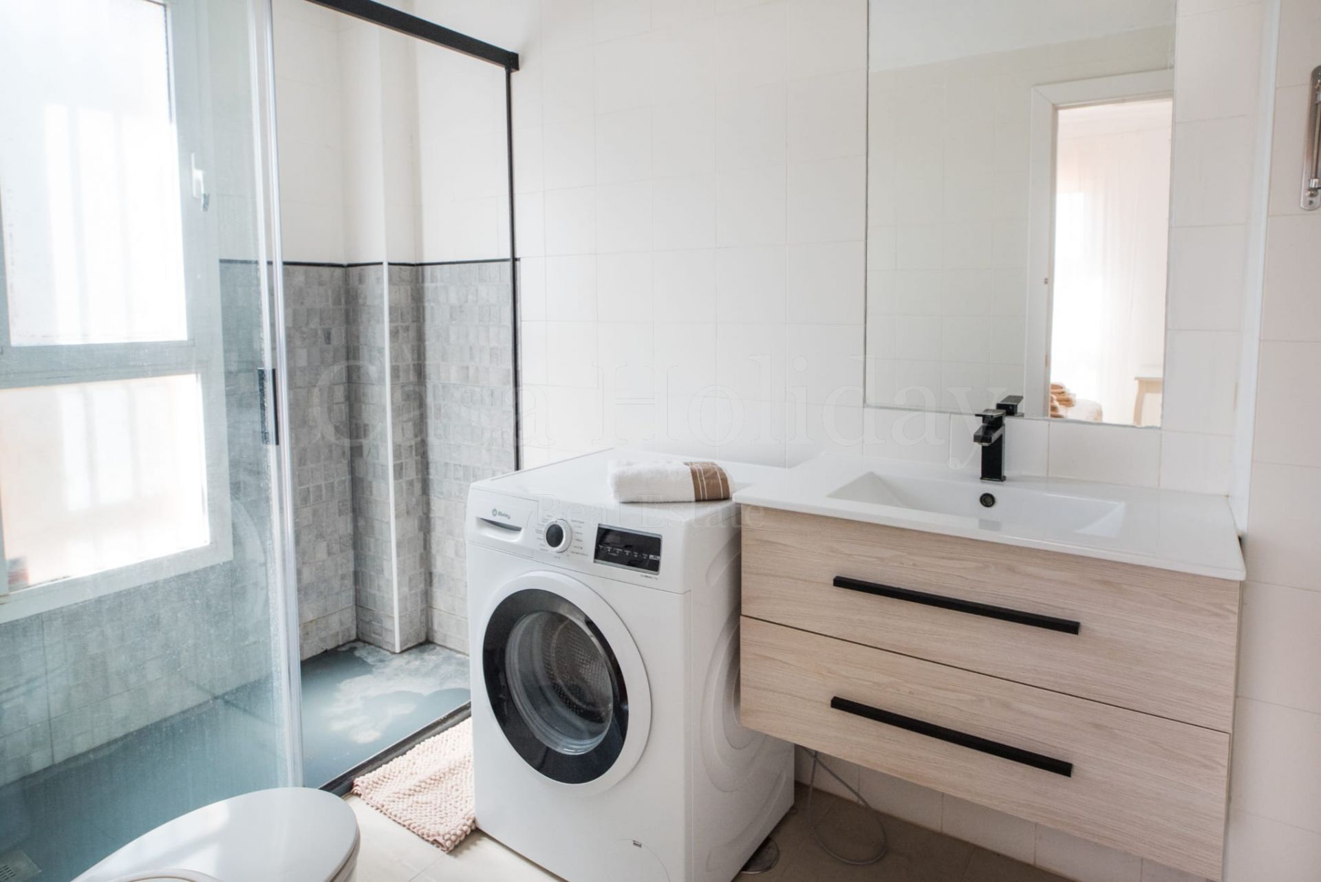 Este apartamento de estilo moderno cuenta con tres dormitorios, una habitación principal con cama doble, otra con cama litera de dos camas individuales y un tercer dormitorio con cama individual. Dispone de un salón-comedor abierto con sofá, cocina totalmente equipada (nevera, horno, microondas, cafetera, lavadora) y dos baños completo con ducha. Grandes ventanales y una terraza amplia privada te permitirán disfrutar de luz natural y vistas al mar y el jardín. La decoración combina tonos neutros con detalles marítimos, ofreciendo un ambiente relajante y moderno. Hay toallas y ropa de cama en el apartamento y ofrece parking privado gratis.
