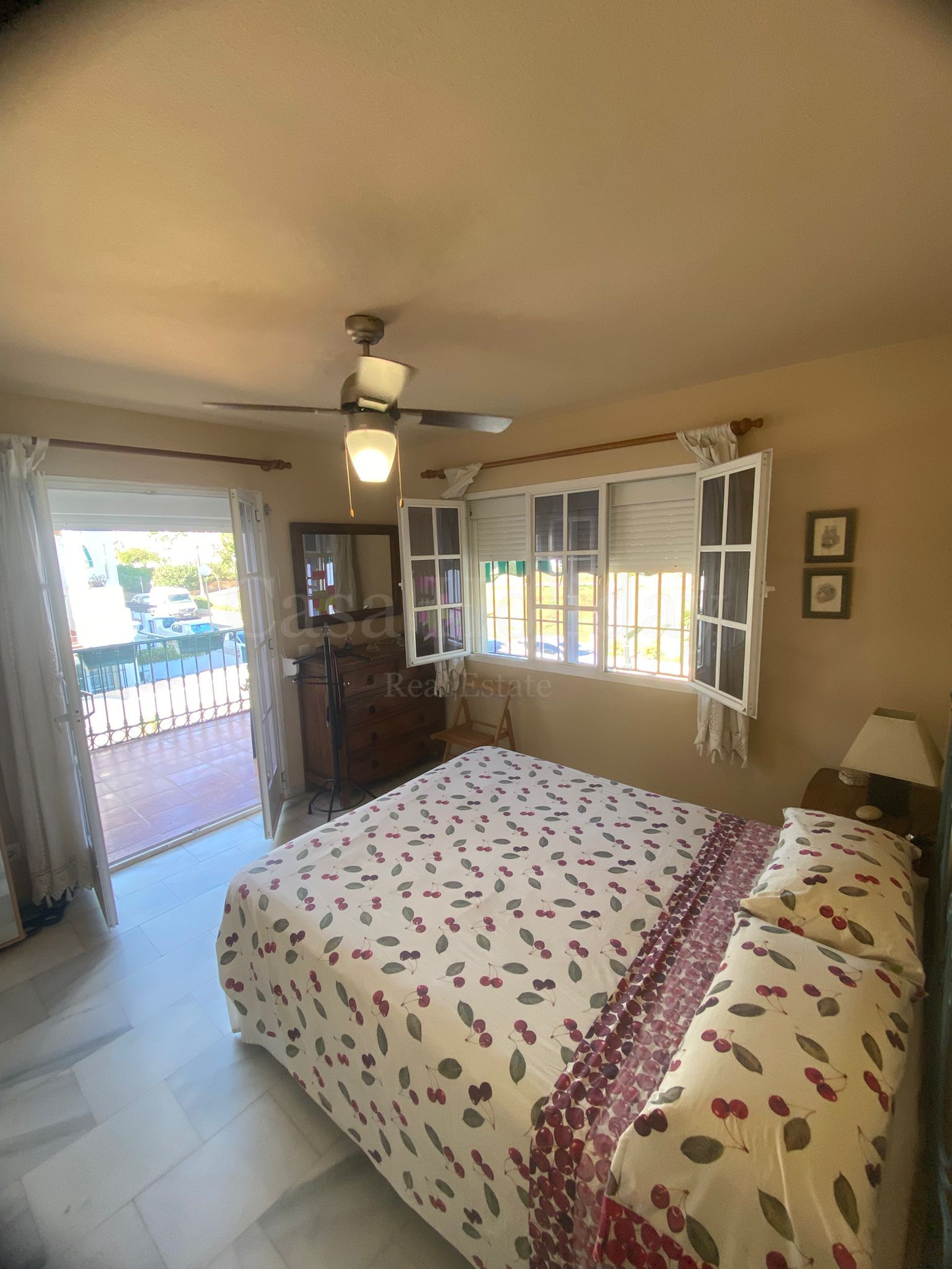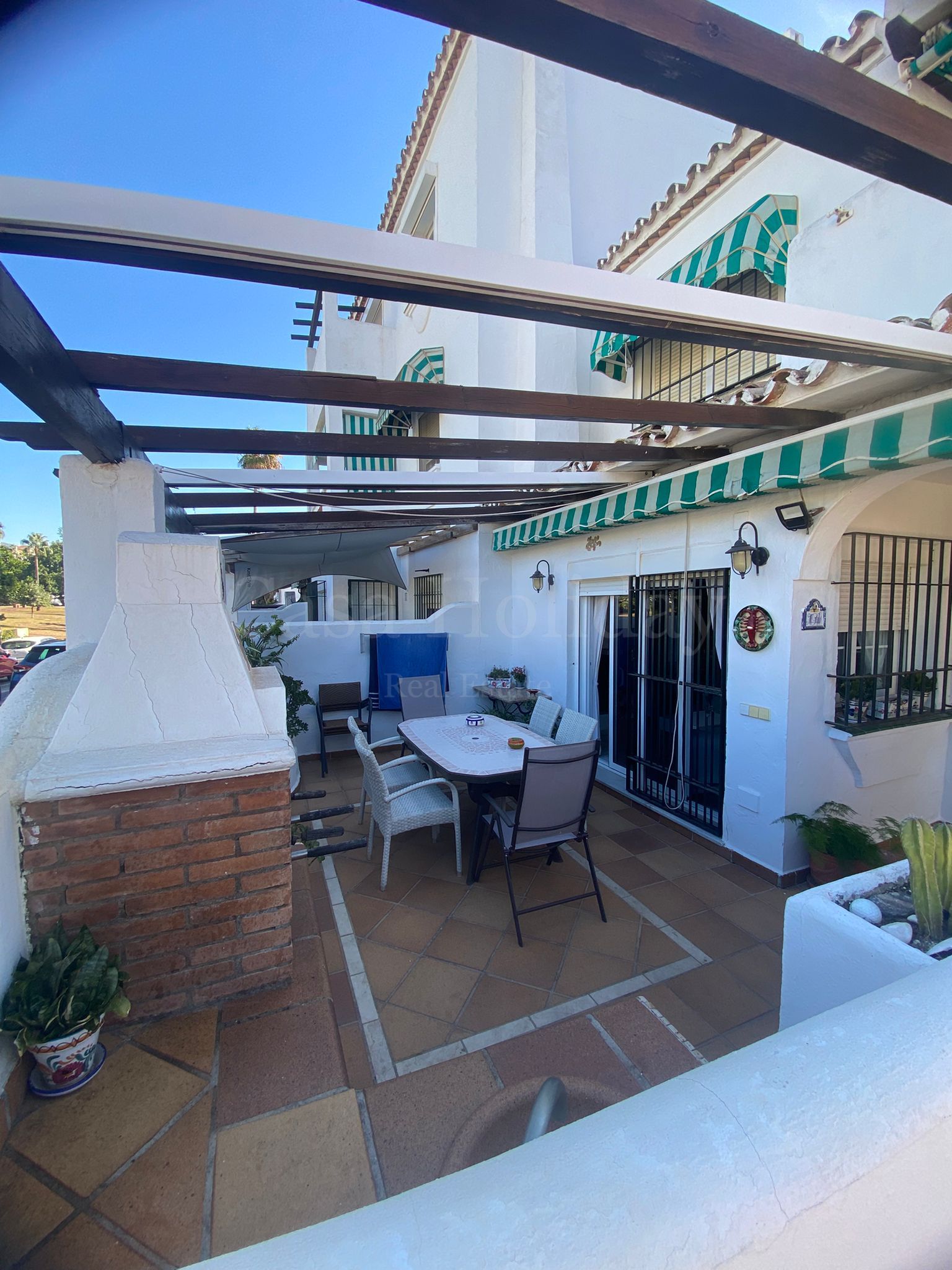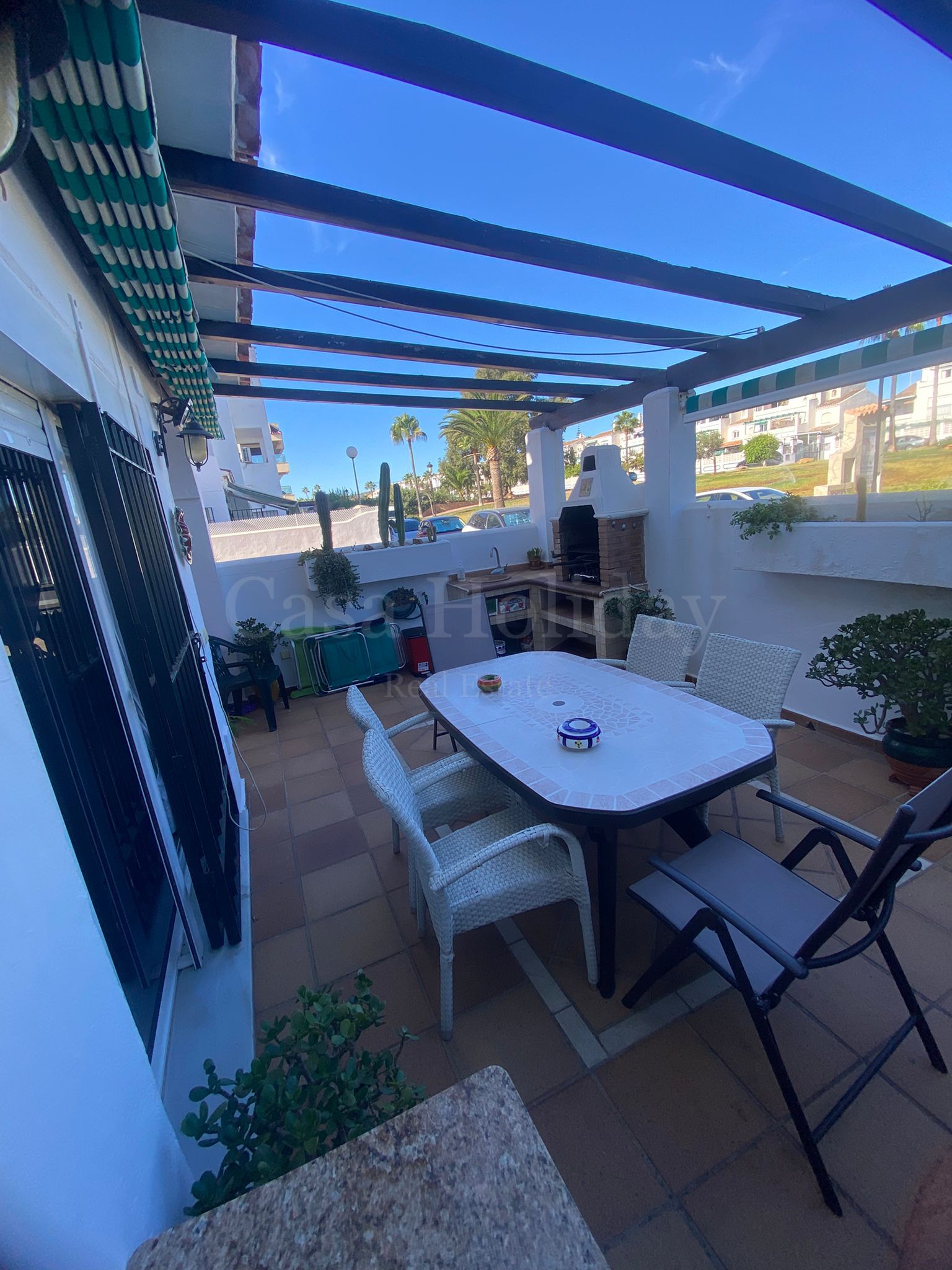 LARGA TEMPORADA. Se alquila este encantador bajo dúplex en una bonita y cuidada urbanización en primera línea de playa, al lado del histórico Castillo de la Duquesa, sus bares y restaurantes, con piscina de uso todo el año y a solo 3 minutos andando al puerto de la Duquesa. Este apartamento dispone de entrada independiente. Cuenta con una amplia terraza con toldo retráctil y barbacoa, otro espacio exterior cubierto, salón con chimenea, cocina completa y aseo. En la planta superior, 2 dormitorios con un baño completo, así como una terraza adicional con orientación sur y acceso desde el dormitorio principal.