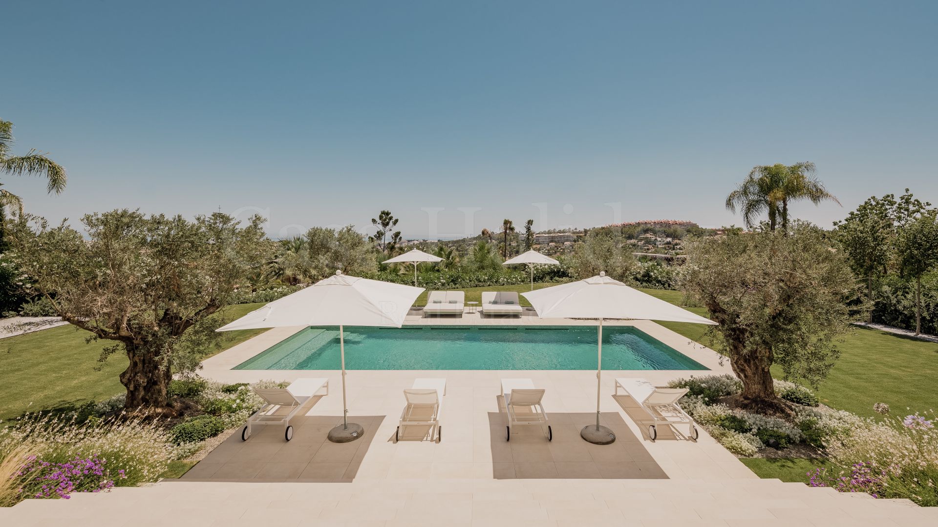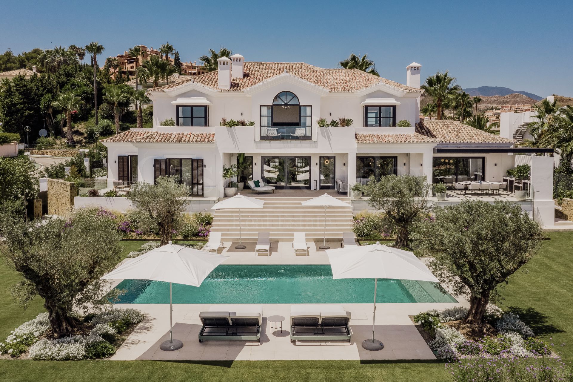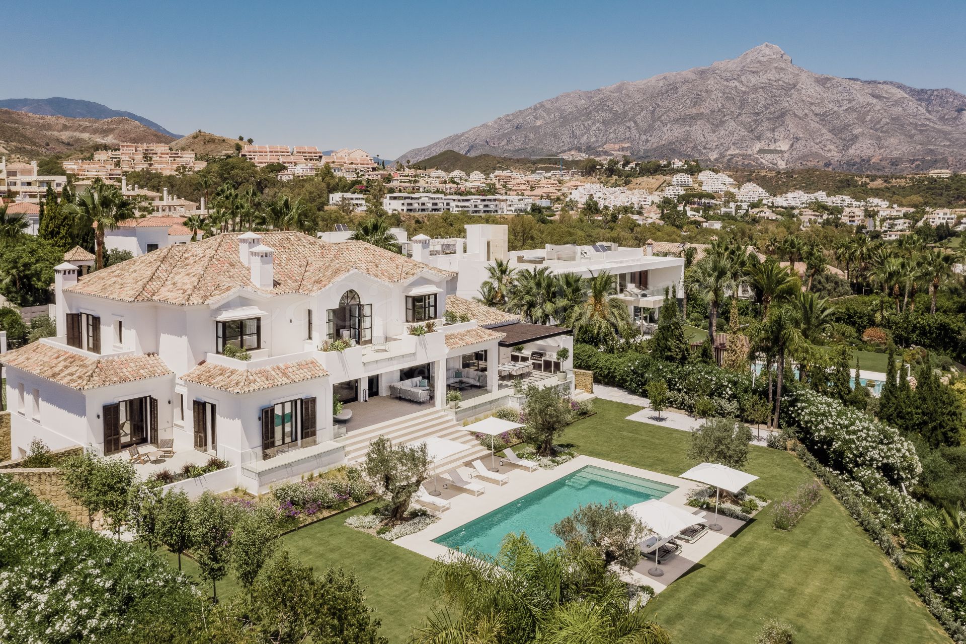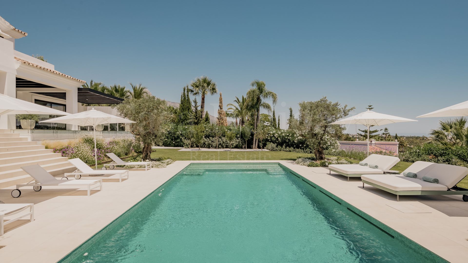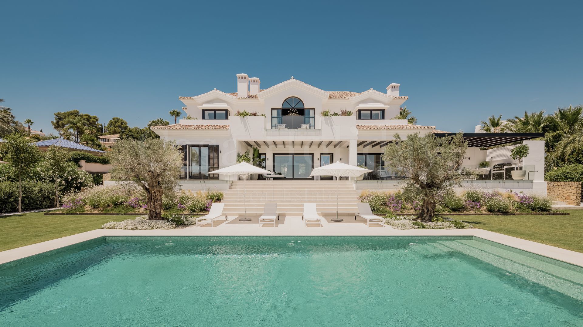 Villa Oliva es una propiedad hermosa y atemporal en venta en la prestigiosa comunidad de La Cerquilla, Nueva Andalucía. Recientemente reformada por completo con altos estándares, esta impresionante propiedad está situada en la calle principal de La Cerquilla. Ofrece vistas panorámicas al valle del golf y al mar. La propiedad tiene más de 1,000m2, distribuidos en 3 niveles, y se encuentra en una parcela de casi 3,000m2, lo que la convierte en una de las villas más grandes disponibles en La Cerquilla. Un impresionante patio de entrada con espacio para varios coches conduce a una entrada espaciosa con un techo de doble altura y vistas impresionantes al mar. El vestíbulo conduce directamente a una amplia sala de estar con fantásticas vistas al mar, un comedor que da al mar y una gran cocina abierta con una sala de televisión / familiar adyacente. Estas habitaciones tienen vistas al mar y conducen directamente a la terraza cubierta principal con una barbacoa incorporada y espacio para comer y descansar al aire libre. También en este nivel hay 3 dormitorios dobles con baños en suite y vestidores privados; uno de los dormitorios de invitados da al jardín, mientras que los otros dos dan al mar con terrazas privadas al aire libre.