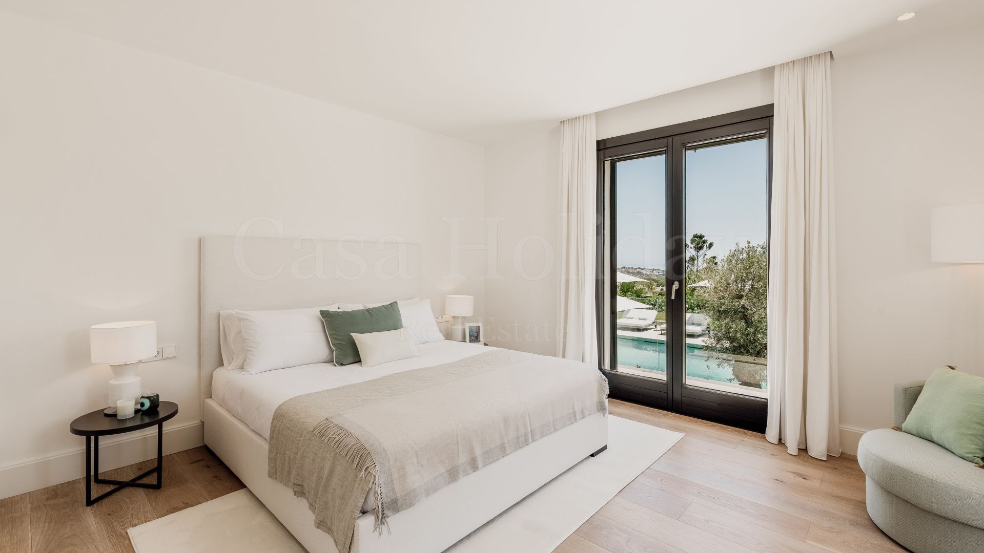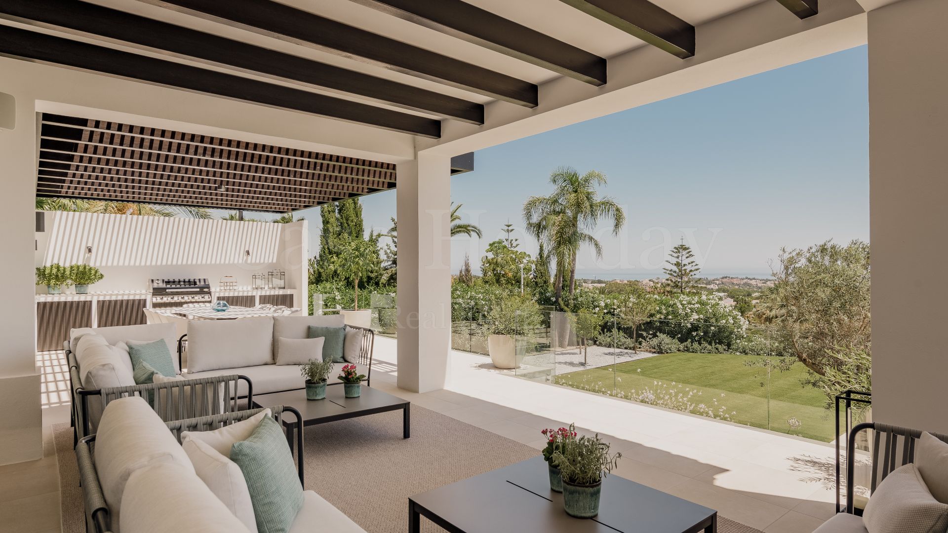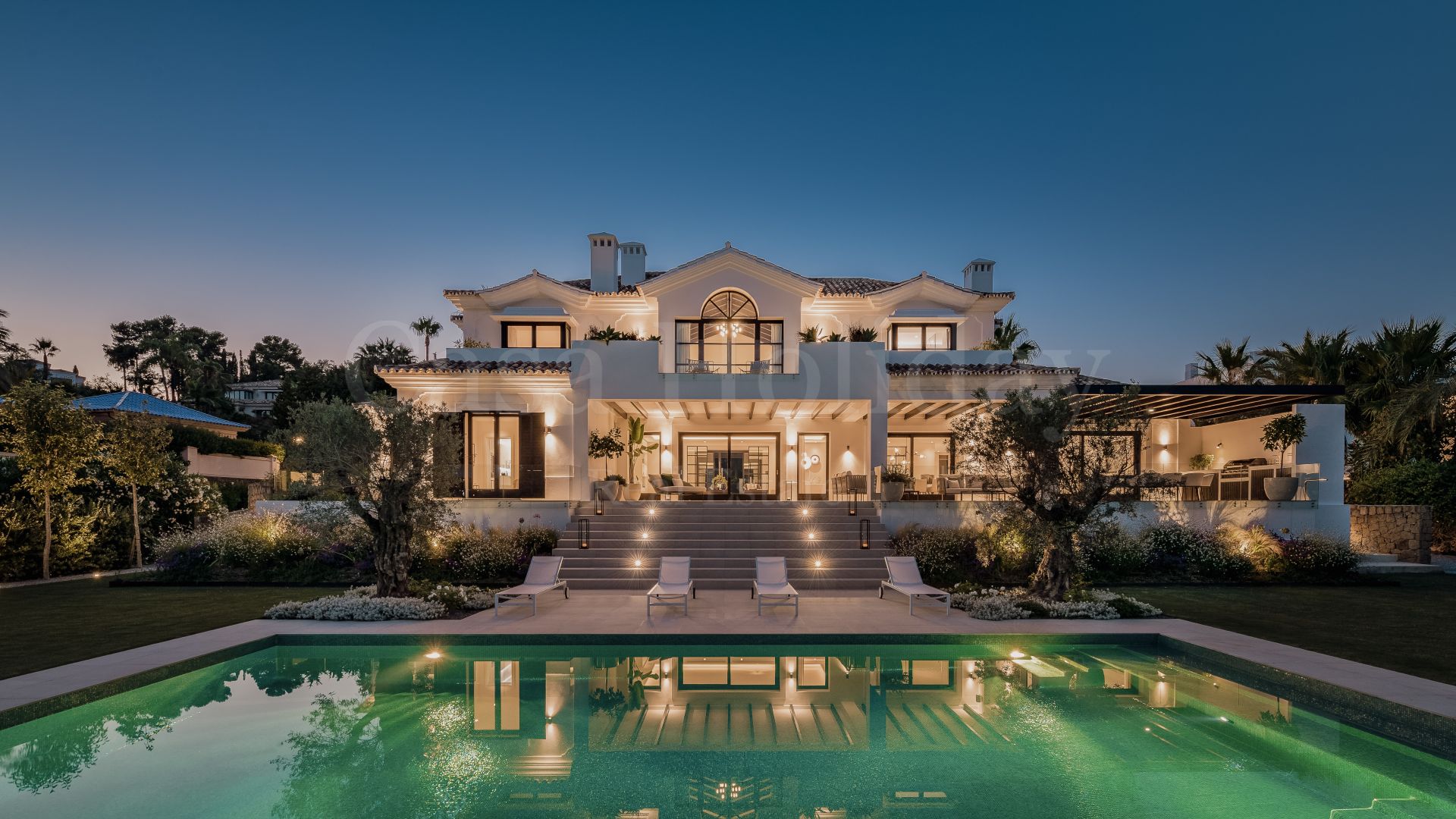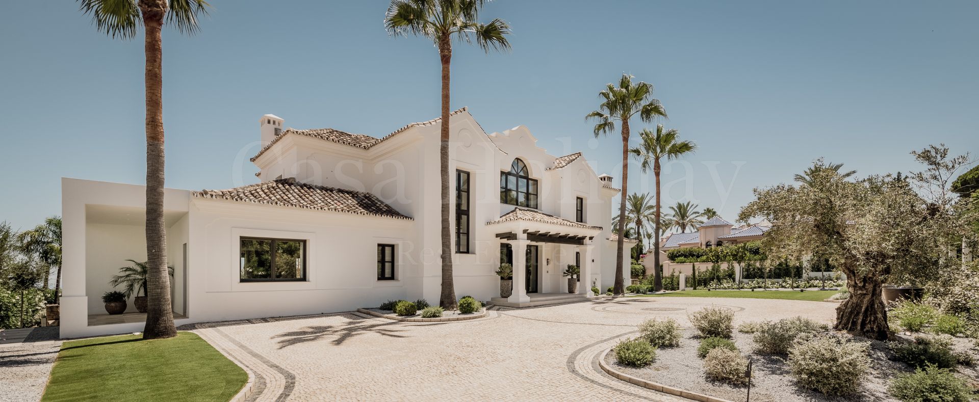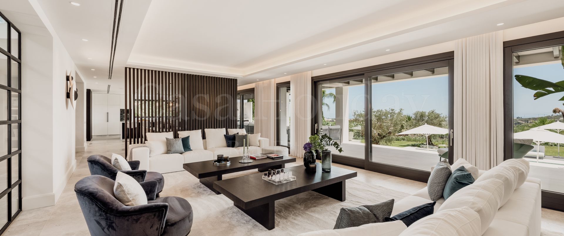 Villa Oliva es una propiedad hermosa y atemporal en venta en la prestigiosa comunidad de La Cerquilla, Nueva Andalucía. Recientemente reformada por completo con altos estándares, esta impresionante propiedad está situada en la calle principal de La Cerquilla. Ofrece vistas panorámicas al valle del golf y al mar. La propiedad tiene más de 1,000m2, distribuidos en 3 niveles, y se encuentra en una parcela de casi 3,000m2, lo que la convierte en una de las villas más grandes disponibles en La Cerquilla. Un impresionante patio de entrada con espacio para varios coches conduce a una entrada espaciosa con un techo de doble altura y vistas impresionantes al mar. El vestíbulo conduce directamente a una amplia sala de estar con fantásticas vistas al mar, un comedor que da al mar y una gran cocina abierta con una sala de televisión / familiar adyacente. Estas habitaciones tienen vistas al mar y conducen directamente a la terraza cubierta principal con una barbacoa incorporada y espacio para comer y descansar al aire libre. También en este nivel hay 3 dormitorios dobles con baños en suite y vestidores privados; uno de los dormitorios de invitados da al jardín, mientras que los otros dos dan al mar con terrazas privadas al aire libre.