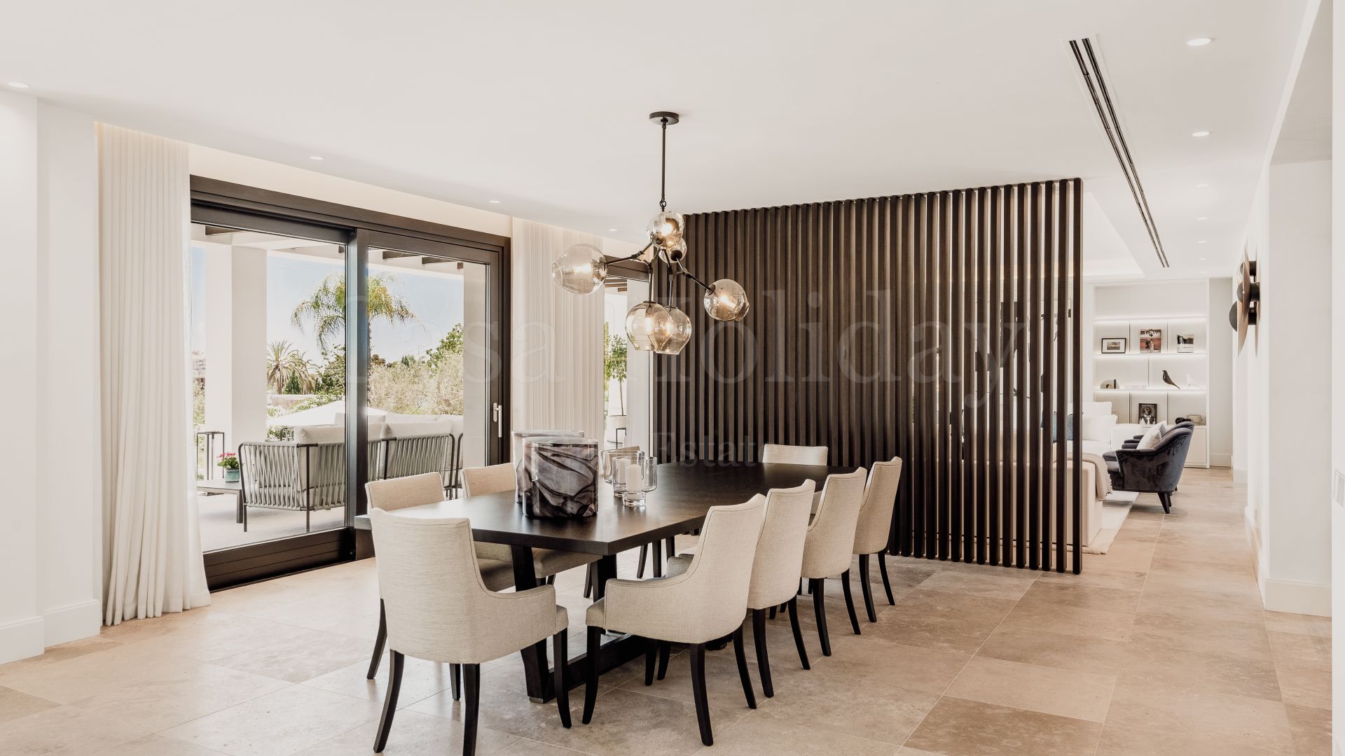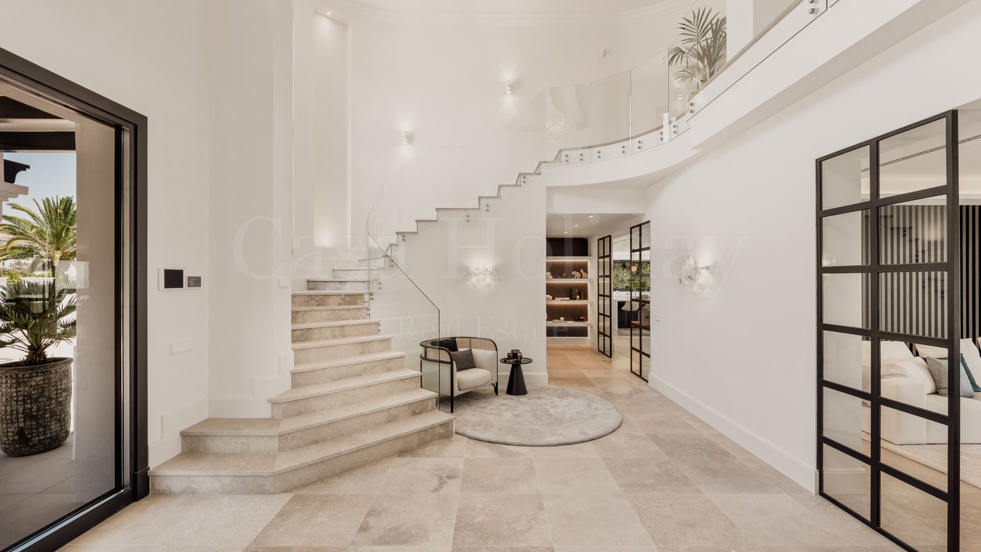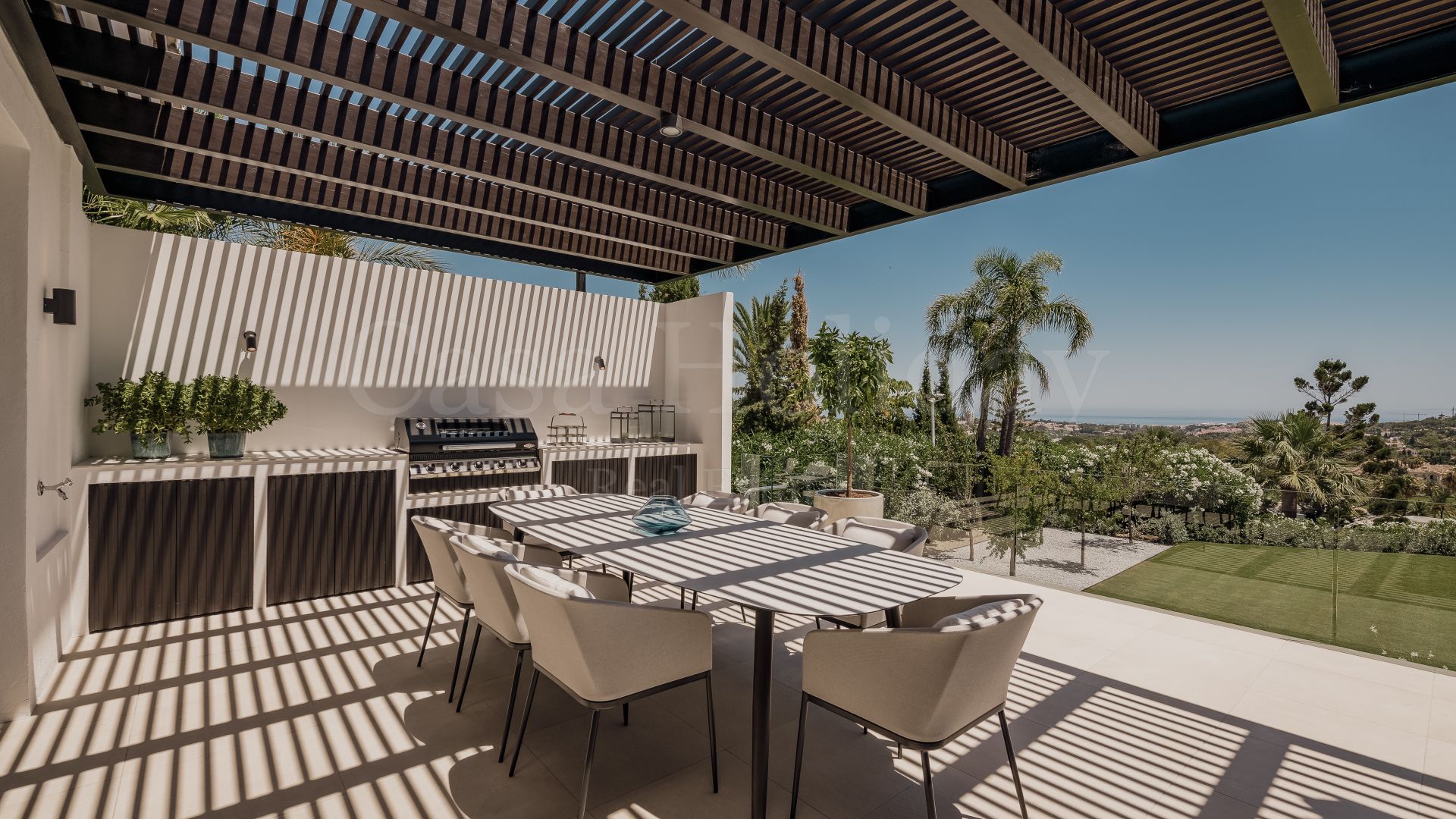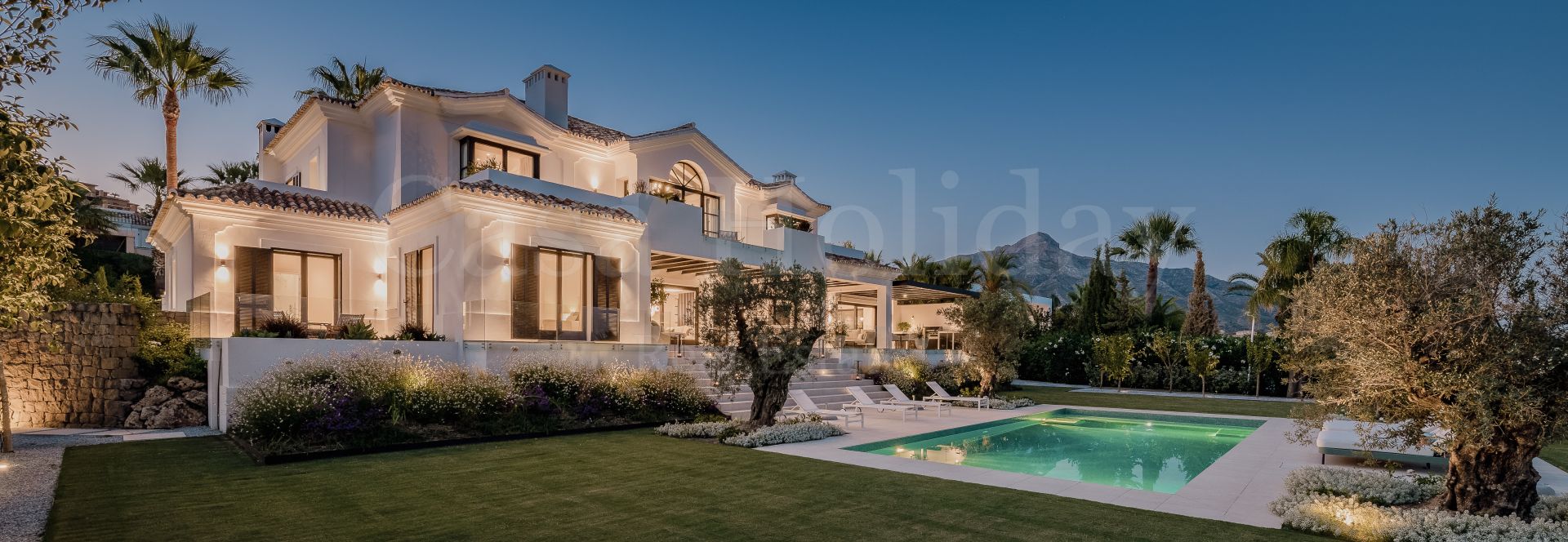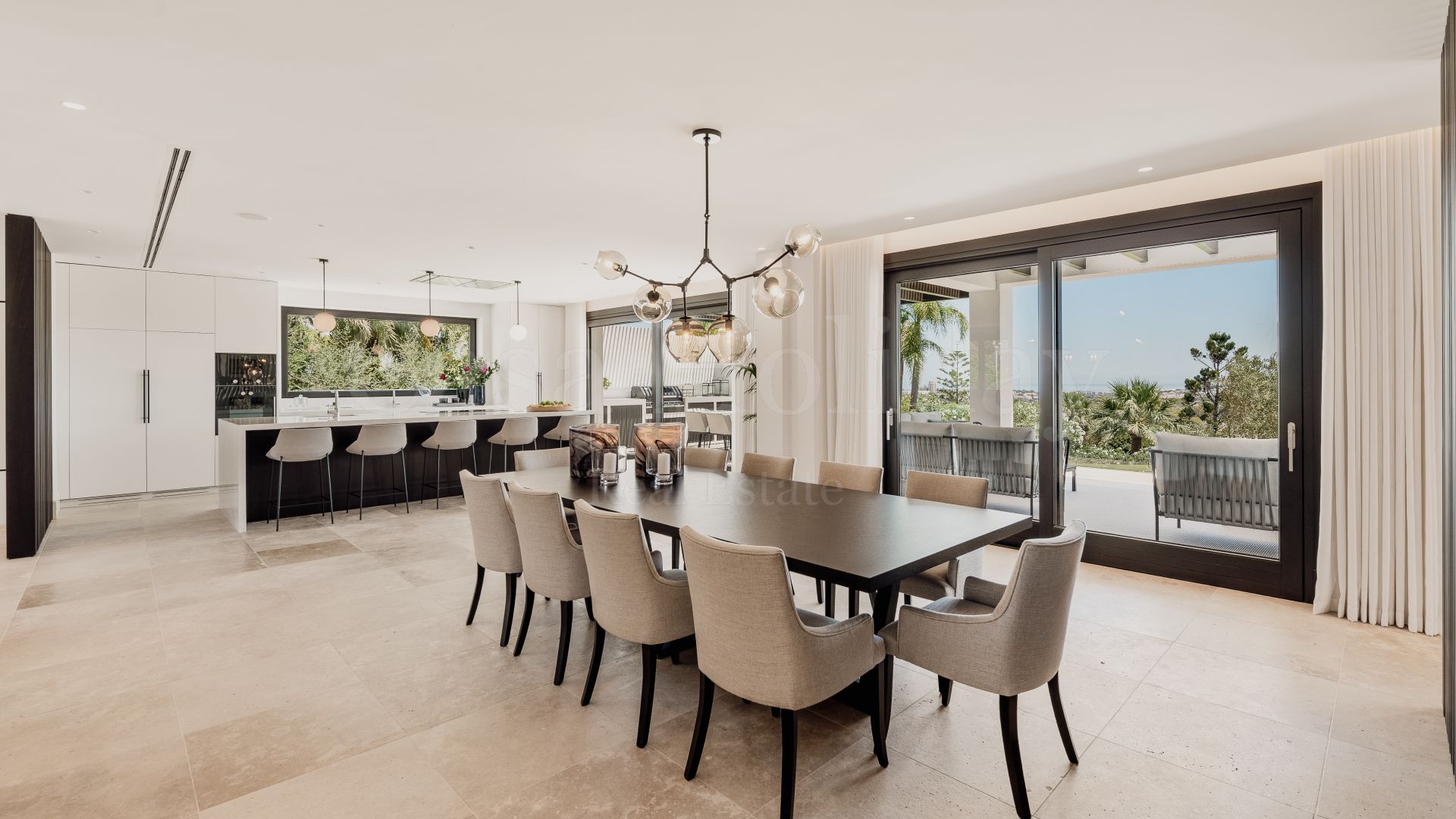 Villa Oliva es una propiedad hermosa y atemporal en venta en la prestigiosa comunidad de La Cerquilla, Nueva Andalucía. Recientemente reformada por completo con altos estándares, esta impresionante propiedad está situada en la calle principal de La Cerquilla. Ofrece vistas panorámicas al valle del golf y al mar. La propiedad tiene más de 1,000m2, distribuidos en 3 niveles, y se encuentra en una parcela de casi 3,000m2, lo que la convierte en una de las villas más grandes disponibles en La Cerquilla. Un impresionante patio de entrada con espacio para varios coches conduce a una entrada espaciosa con un techo de doble altura y vistas impresionantes al mar. El vestíbulo conduce directamente a una amplia sala de estar con fantásticas vistas al mar, un comedor que da al mar y una gran cocina abierta con una sala de televisión / familiar adyacente. Estas habitaciones tienen vistas al mar y conducen directamente a la terraza cubierta principal con una barbacoa incorporada y espacio para comer y descansar al aire libre. También en este nivel hay 3 dormitorios dobles con baños en suite y vestidores privados; uno de los dormitorios de invitados da al jardín, mientras que los otros dos dan al mar con terrazas privadas al aire libre.