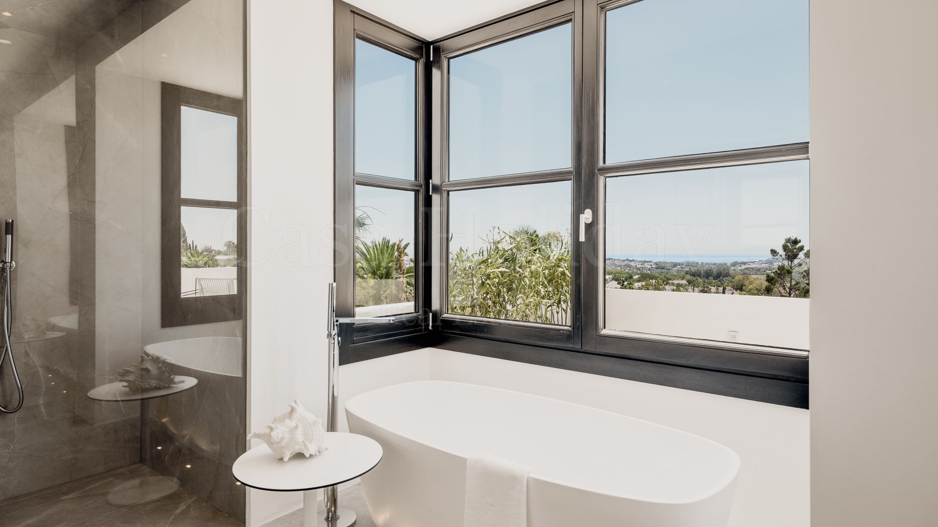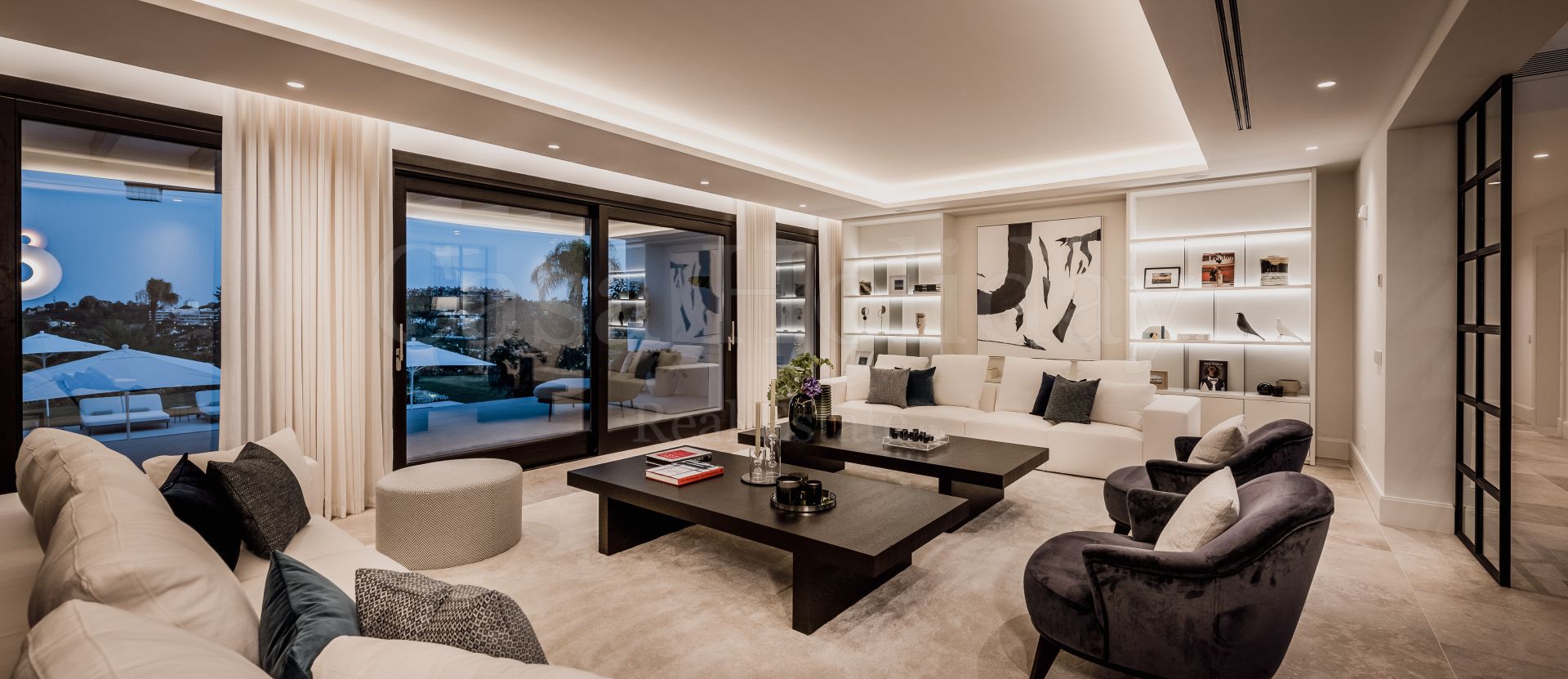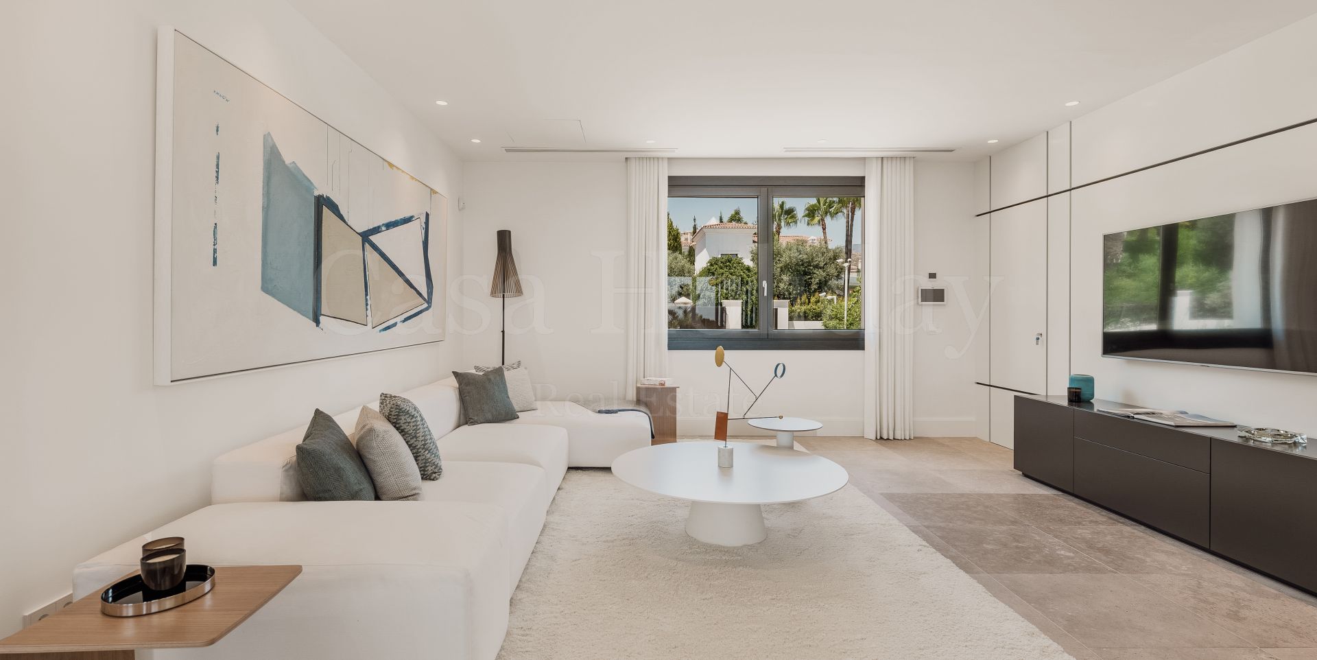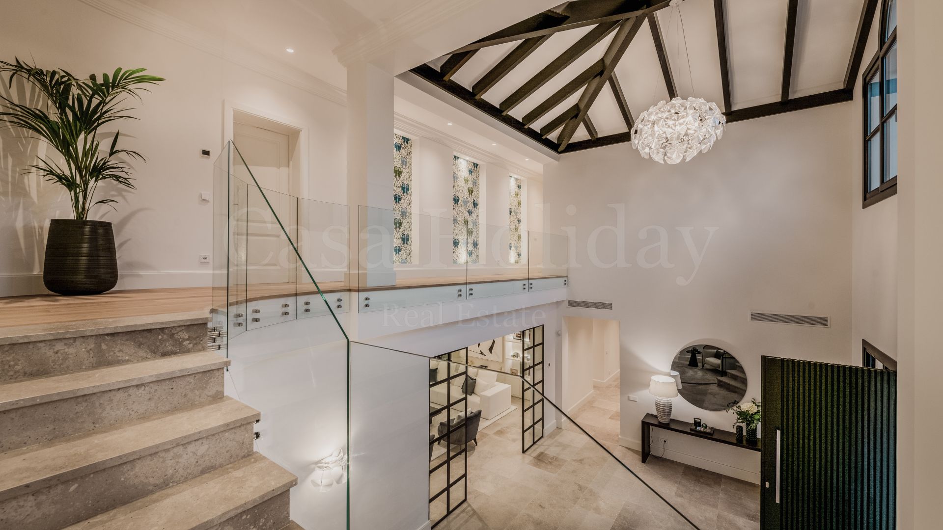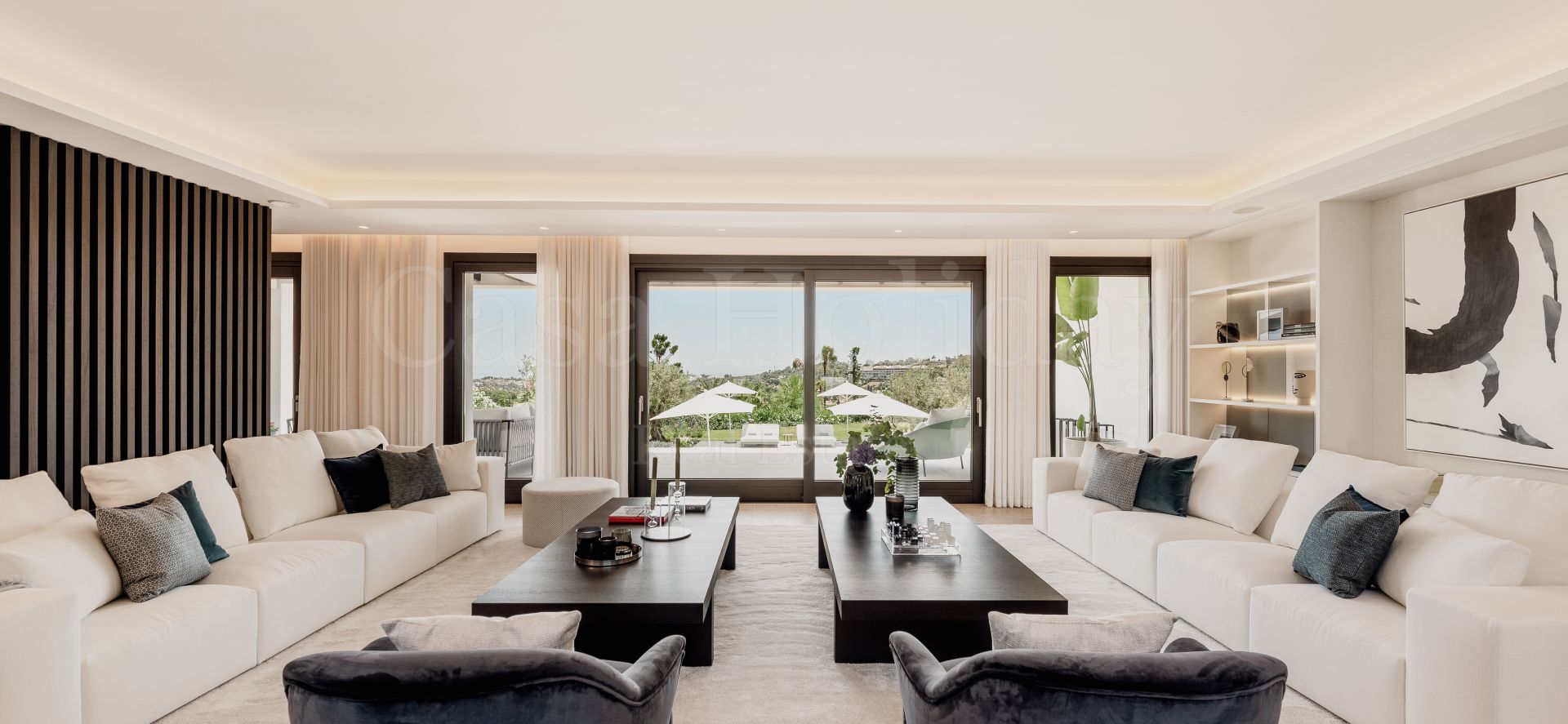 Villa Oliva es una propiedad hermosa y atemporal en venta en la prestigiosa comunidad de La Cerquilla, Nueva Andalucía. Recientemente reformada por completo con altos estándares, esta impresionante propiedad está situada en la calle principal de La Cerquilla. Ofrece vistas panorámicas al valle del golf y al mar. La propiedad tiene más de 1,000m2, distribuidos en 3 niveles, y se encuentra en una parcela de casi 3,000m2, lo que la convierte en una de las villas más grandes disponibles en La Cerquilla. Un impresionante patio de entrada con espacio para varios coches conduce a una entrada espaciosa con un techo de doble altura y vistas impresionantes al mar. El vestíbulo conduce directamente a una amplia sala de estar con fantásticas vistas al mar, un comedor que da al mar y una gran cocina abierta con una sala de televisión / familiar adyacente. Estas habitaciones tienen vistas al mar y conducen directamente a la terraza cubierta principal con una barbacoa incorporada y espacio para comer y descansar al aire libre. También en este nivel hay 3 dormitorios dobles con baños en suite y vestidores privados; uno de los dormitorios de invitados da al jardín, mientras que los otros dos dan al mar con terrazas privadas al aire libre.