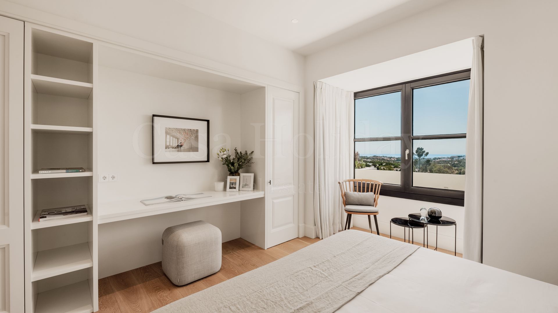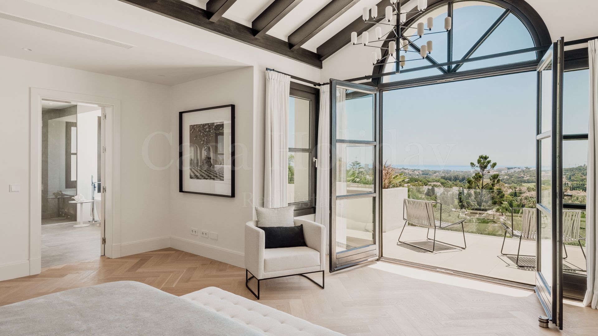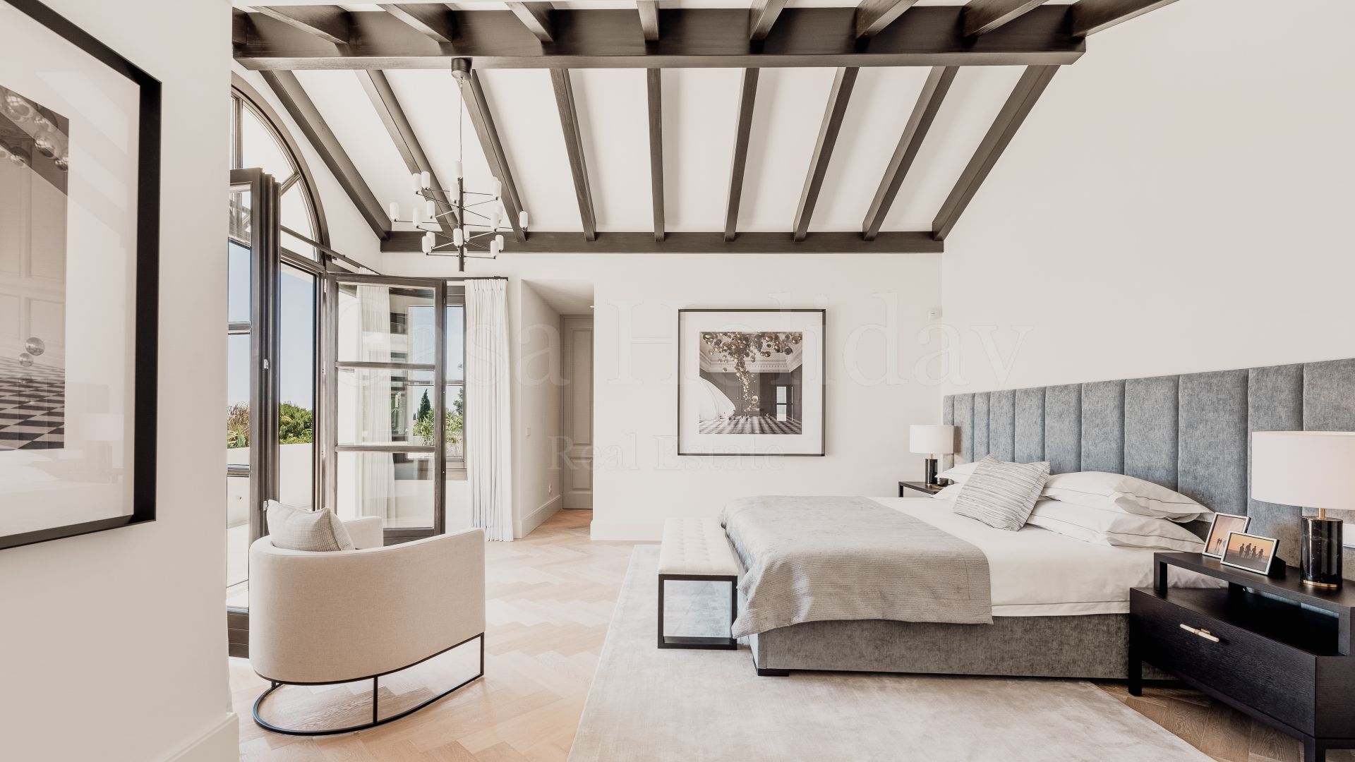 La planta superior cuenta con otros tres dormitorios con baños en suite y vestidores. Uno de los dormitorios de invitados da al mar con una terraza privada, mientras que el otro, actualmente utilizado como oficina, da al jardín. La gran suite principal tiene una terraza privada con vistas al mar, dos vestidores y un baño lujosamente equipado con vistas al mar.