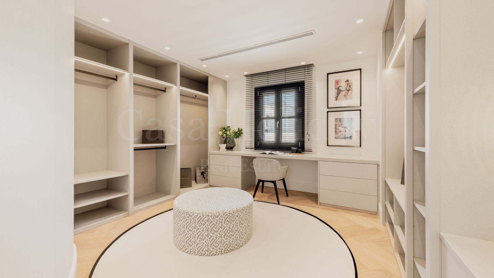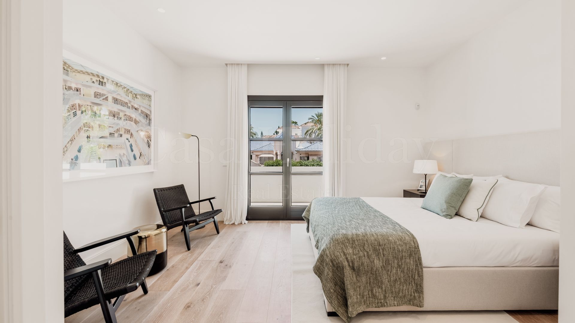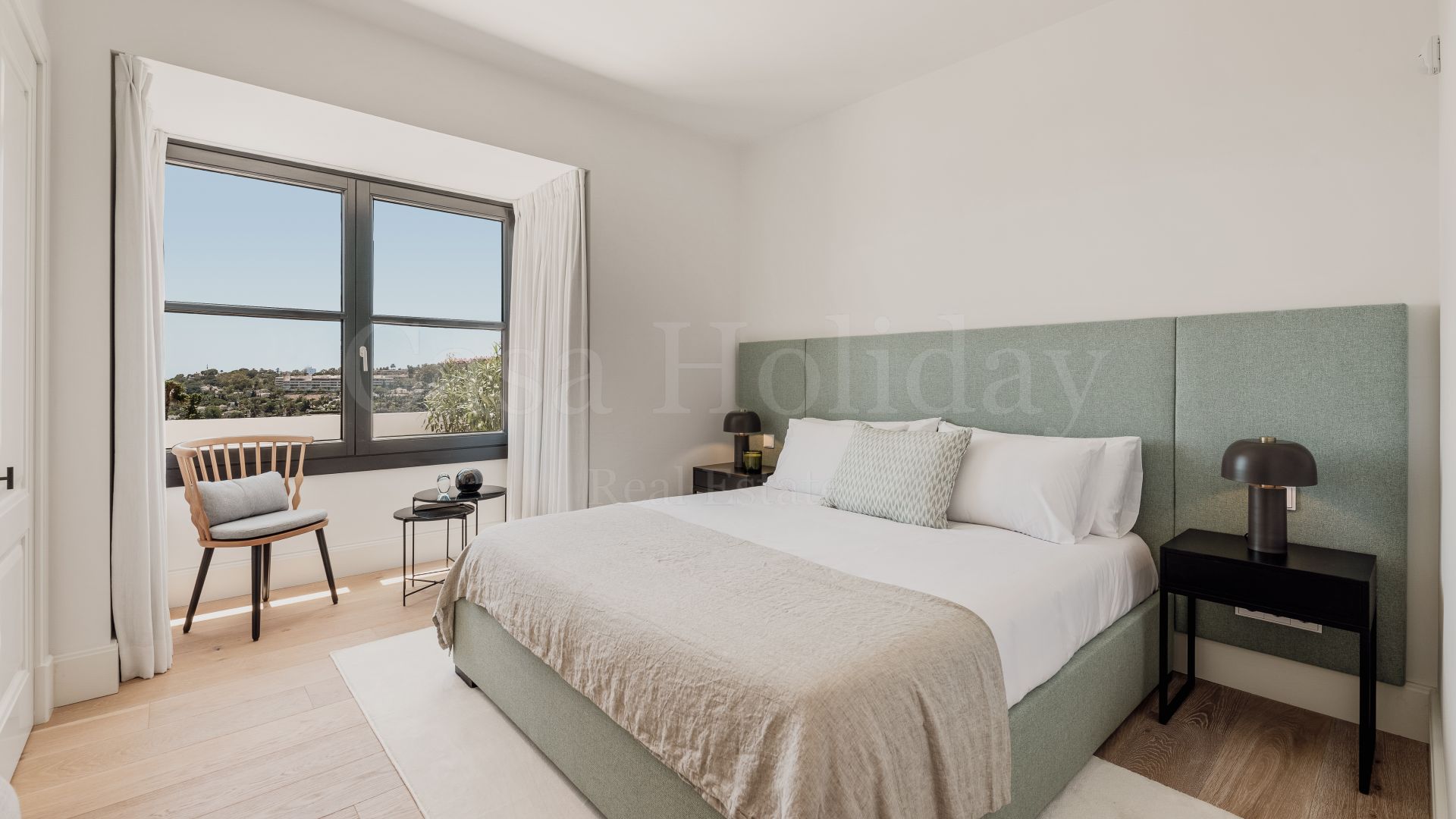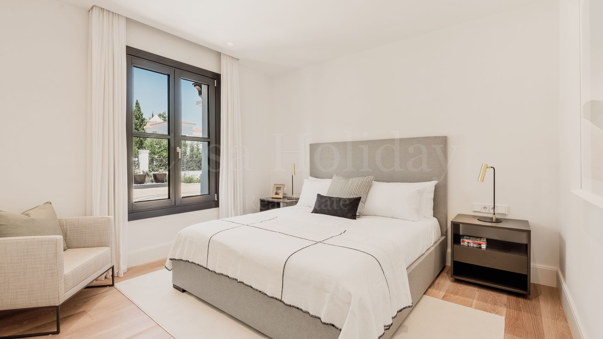 La planta superior cuenta con otros tres dormitorios con baños en suite y vestidores. Uno de los dormitorios de invitados da al mar con una terraza privada, mientras que el otro, actualmente utilizado como oficina, da al jardín. La gran suite principal tiene una terraza privada con vistas al mar, dos vestidores y un baño lujosamente equipado con vistas al mar.