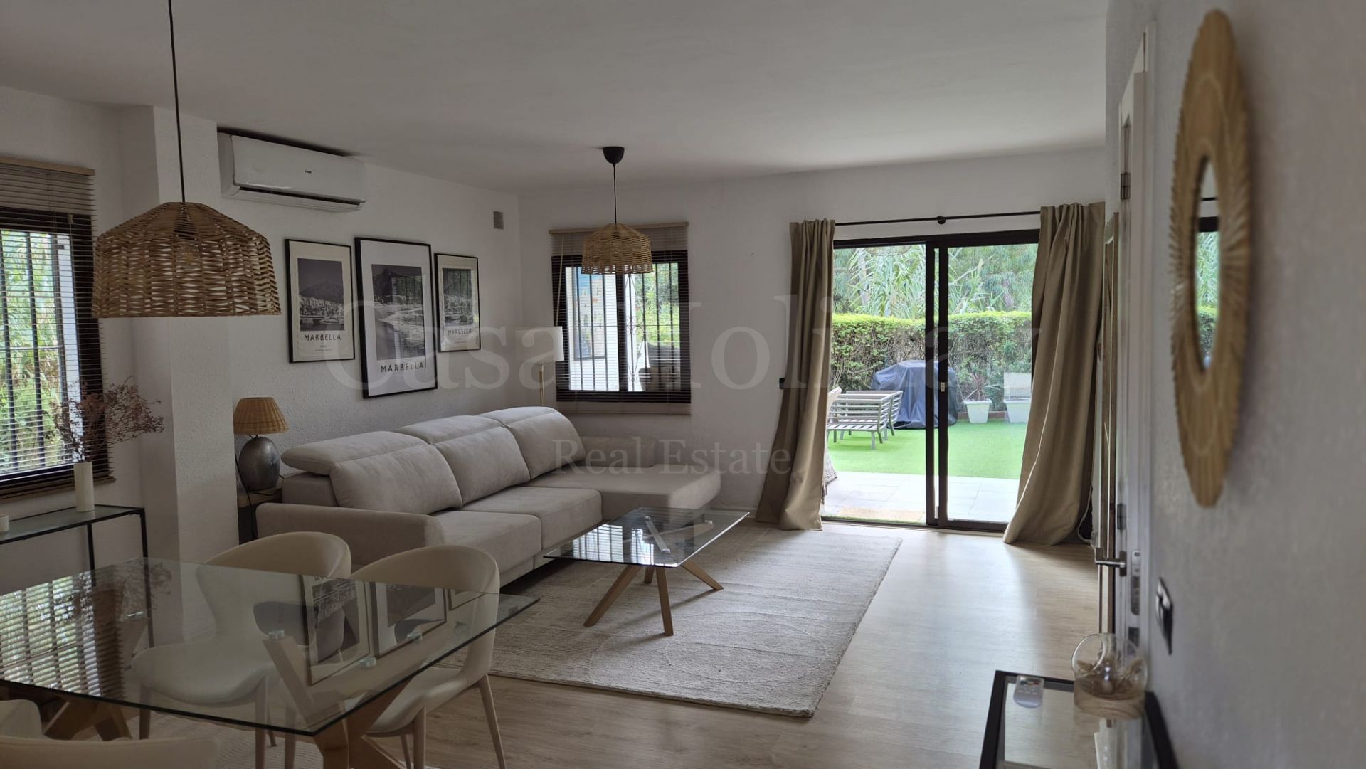 Esta casa adosada de dos plantas, con ático y jacuzzi, ha sido completamente reformada, incluyendo suelos, paredes, cocina y baños. La casa cuenta con un luminoso salón (interior y exterior) y una terraza privada.
