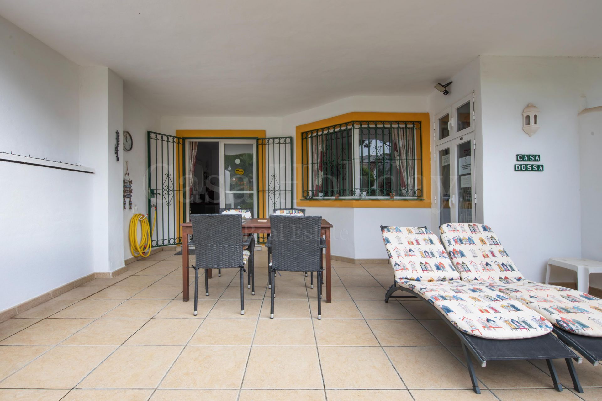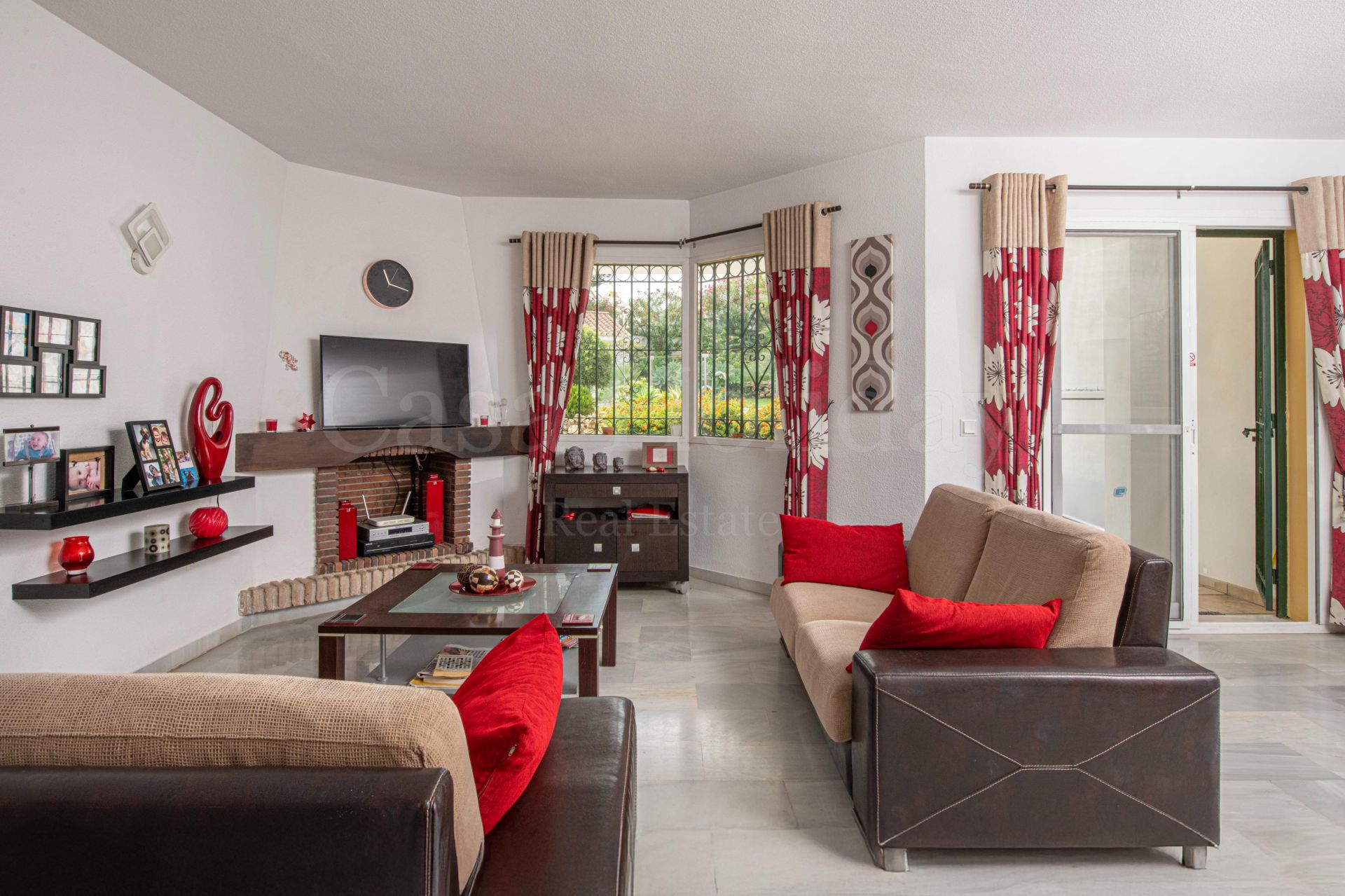 Luminoso y amplio salón con chimenea y acceso directo a una soleada terraza.