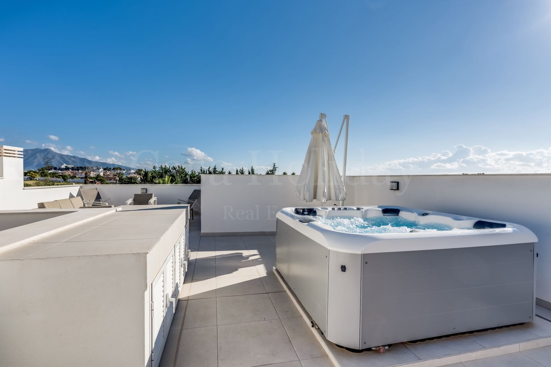 849.000€ 318-02090OL Elegante casa adosada de 3 dormitorios con vistas al mar en El Pirata – New Golden Mile, Estepona Ubicada a pocos pasos de la playa, dentro de la exclusiva comunidad cerrada de “El Pirata”, esta impecable casa adosada de 3 dormitorios...