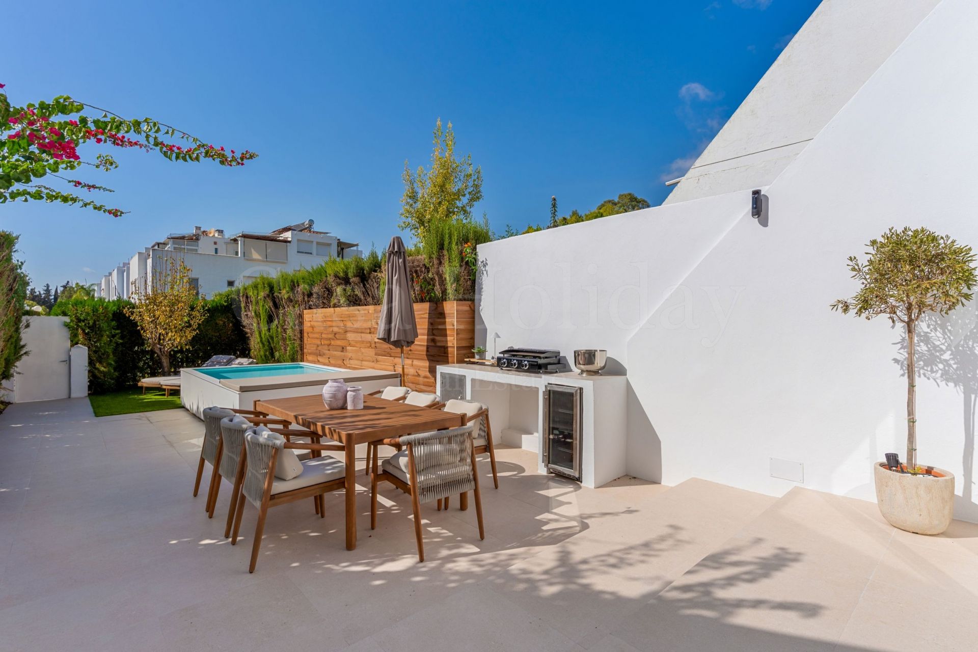 La propiedad cuenta con un amplio estacionamiento y una entrada privada que conduce directamente al exuberante jardín. Aquí le da la bienvenida una terraza orientada al suroeste bañada por el sol, una piscina privada y una cocina exterior, ideales para relajarse y disfrutar con invitados.